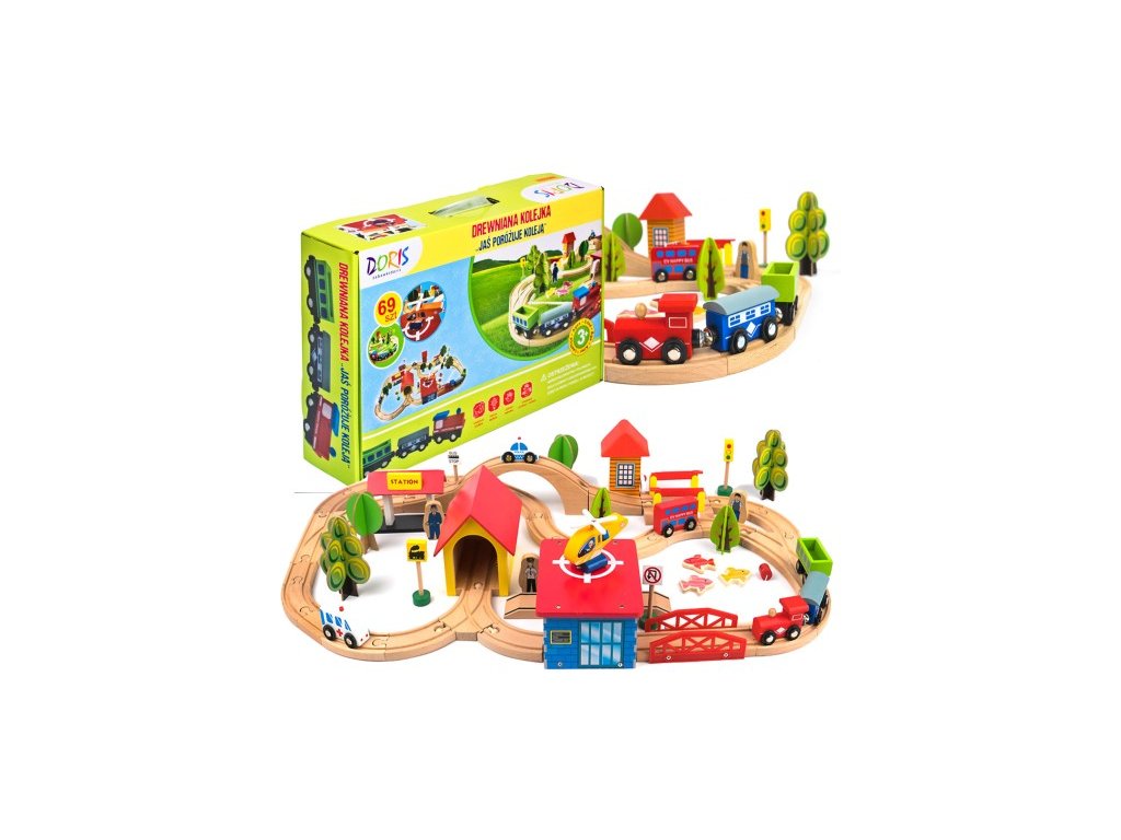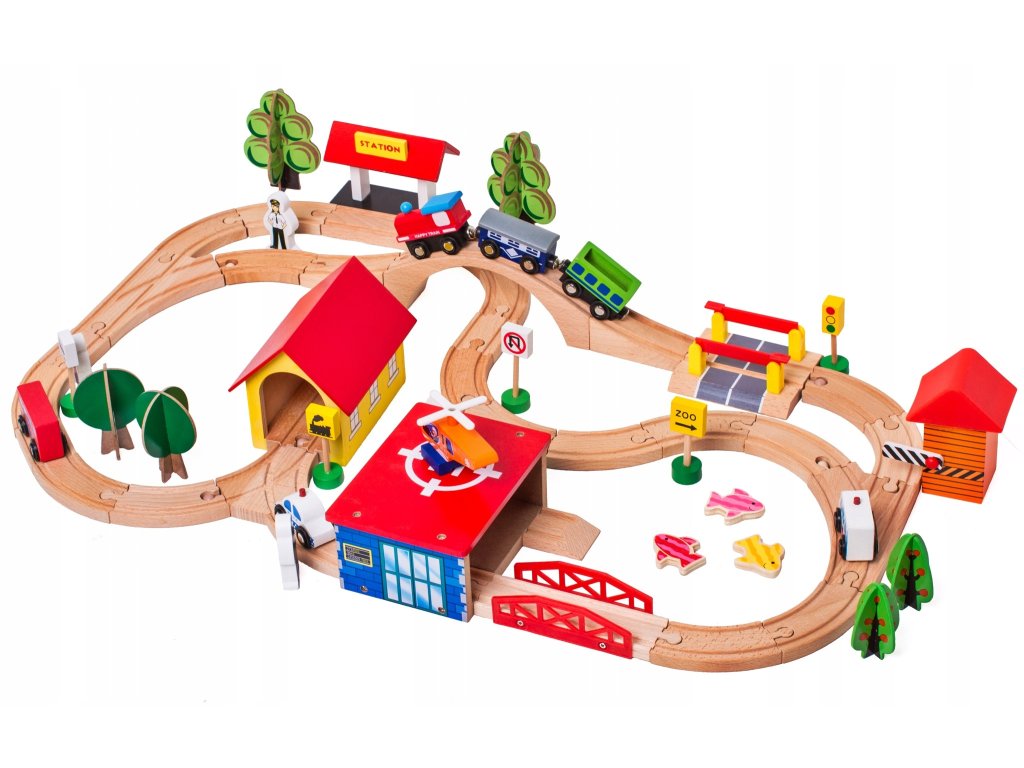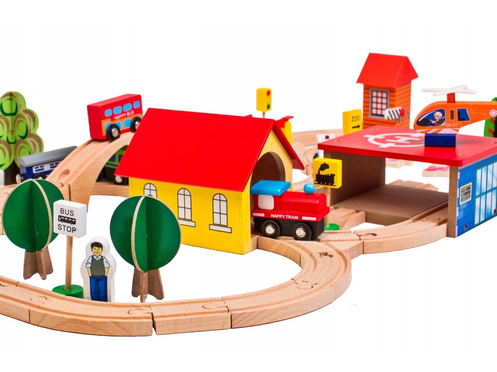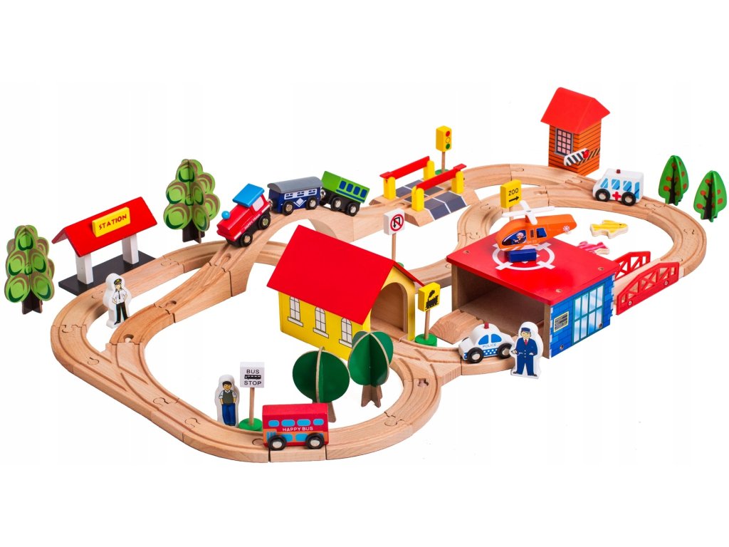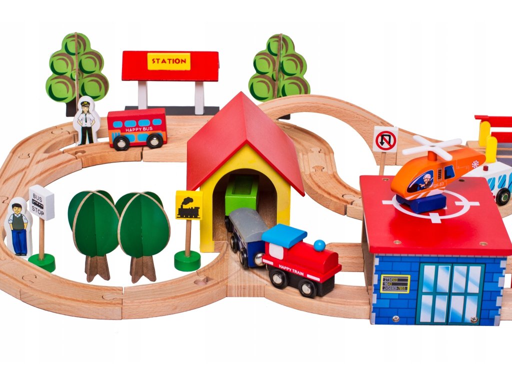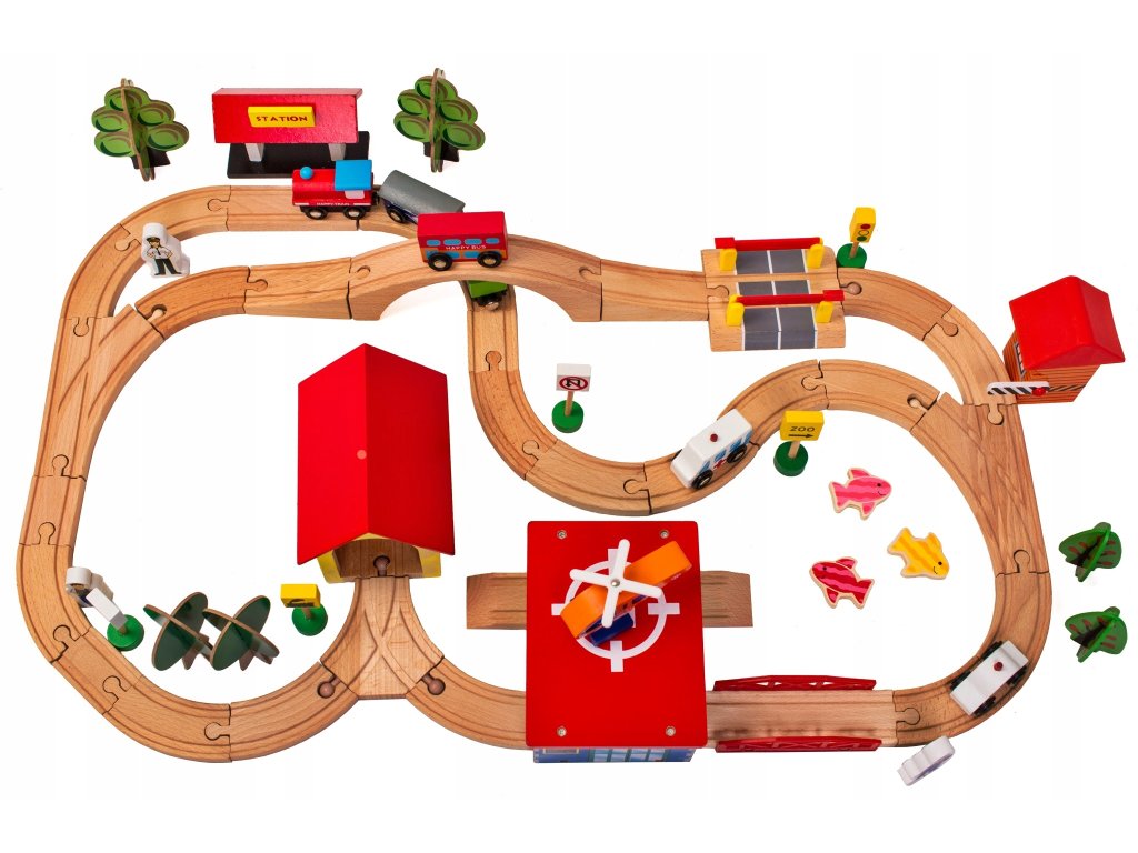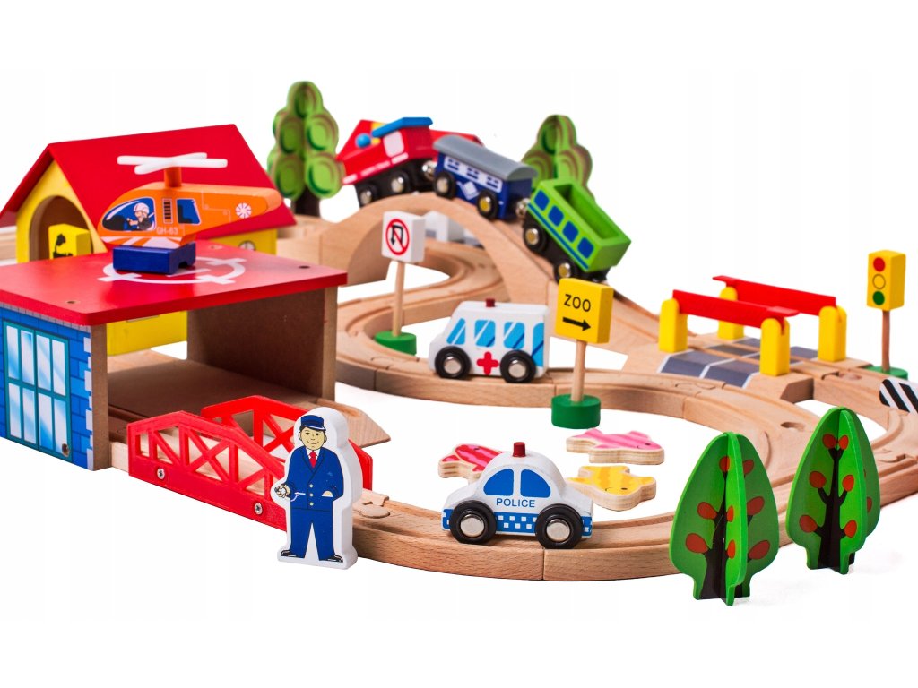 Zcela dřevěná železniční trať má složité tvary a výhybky, most, přistávací plochu pro vrtulník a kompletní budovy a příslušenství pro vzrušující a kreativní zábavu.