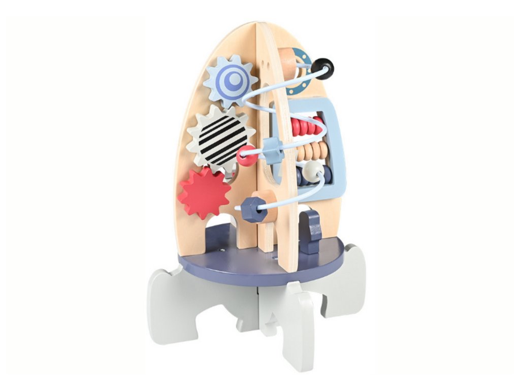 Raketa má stěny s barevnými pohyblivými prvky, které budou stimulovat rozvoj dítěte. Hračka má bludiště s korálky, rotující ozubená kola a malé korálky, které lze použít jako počítadlo.