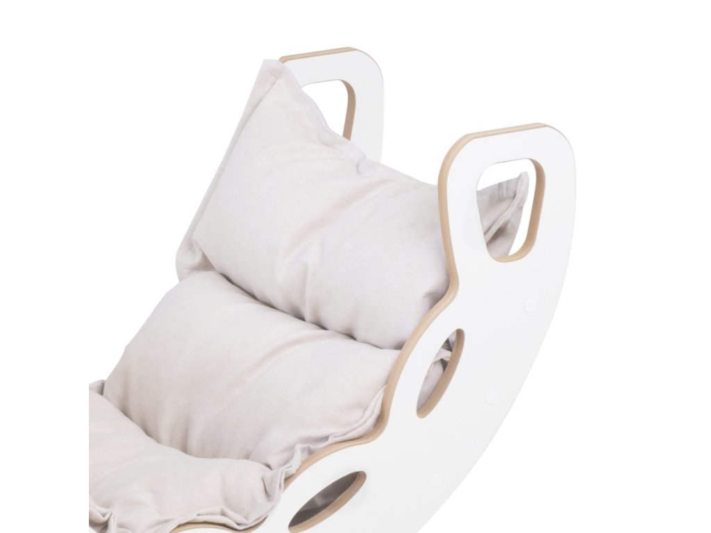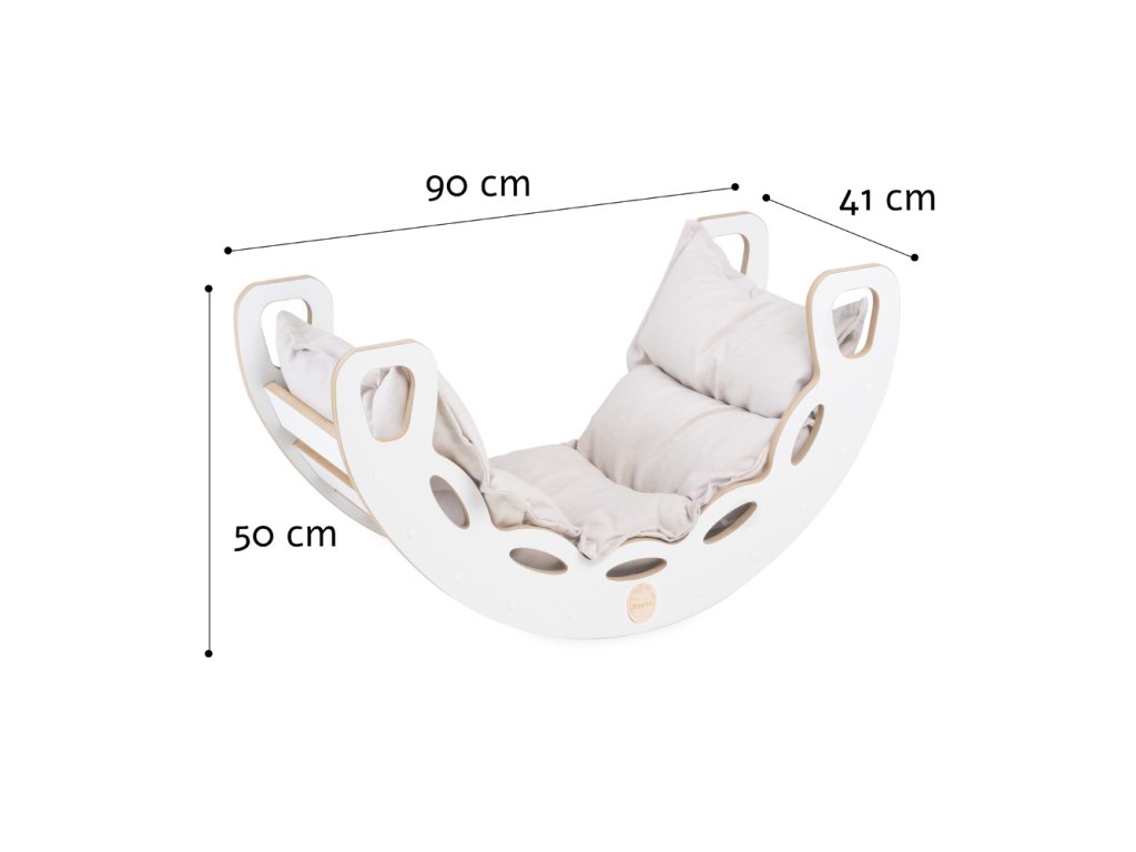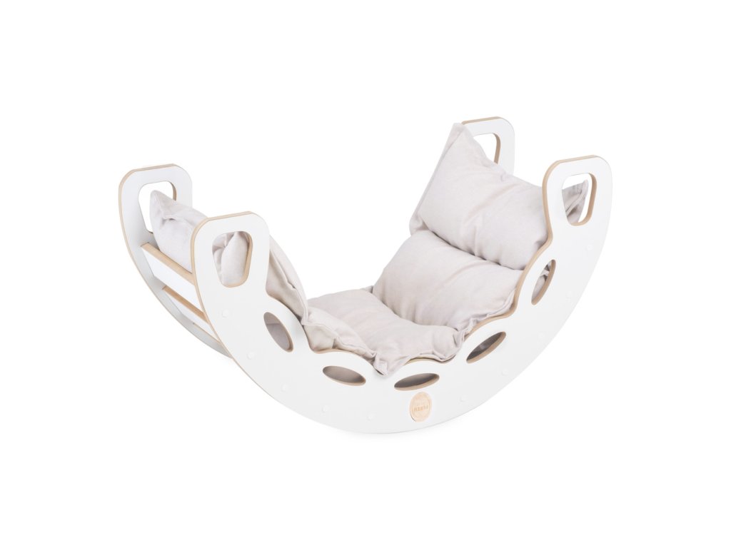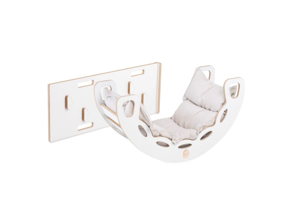 Dřevěné houpátko Mini 4v1 s lezeckou stěnou, skluzavkou a polštářem (světle béžové / bílé)