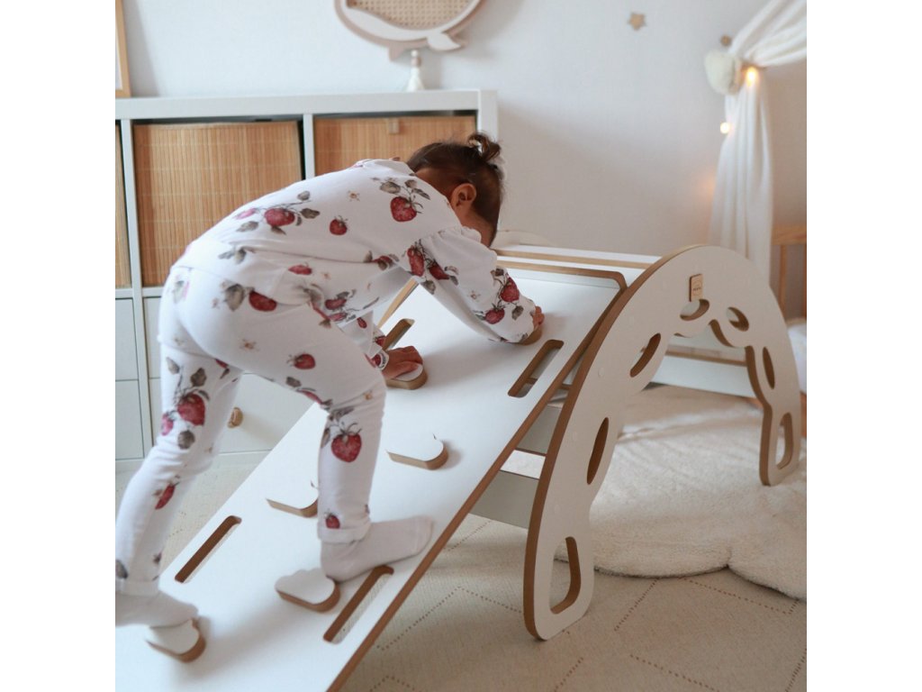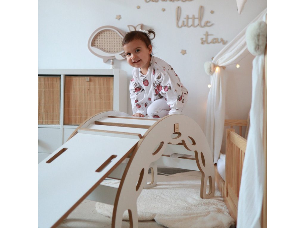 Lezecká stěna a skluzavka: oboustranný prvek, který je hitem v každém dětském pokoji! Na jedné straně dítě rozvíjí své lezecké dovednosti, na druhé si užívá sjíždění skluzavky. Skvělý způsob, jak spojit zábavu s pohybem.
