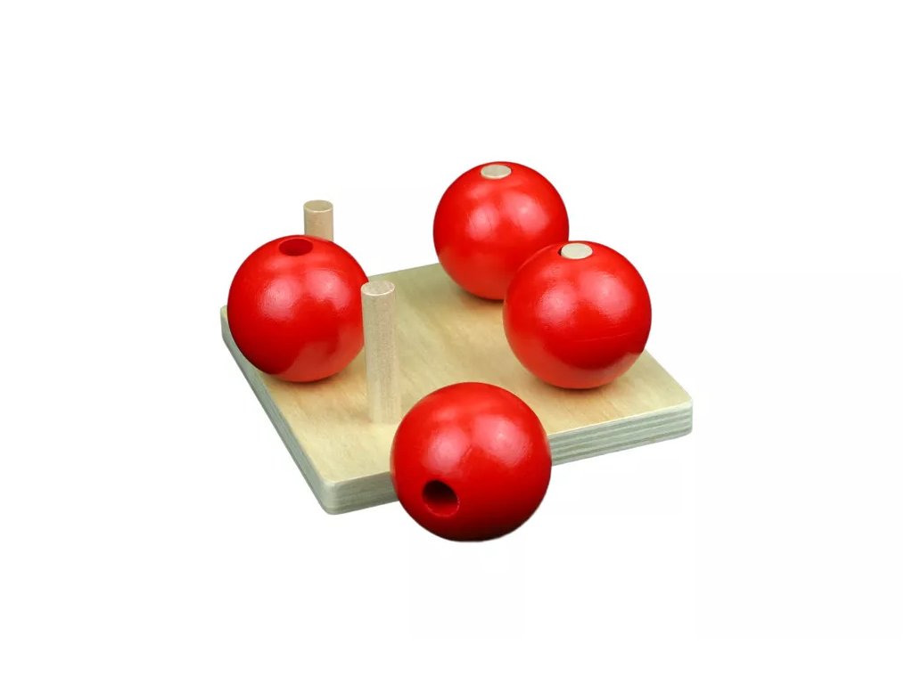 Každá červená koule je navržena tak, aby byla nasaditelná na samostatný kolík vyrobený ze světlého dřeva. Kombinace barev jasně odlišuje kuličky od kolíků.