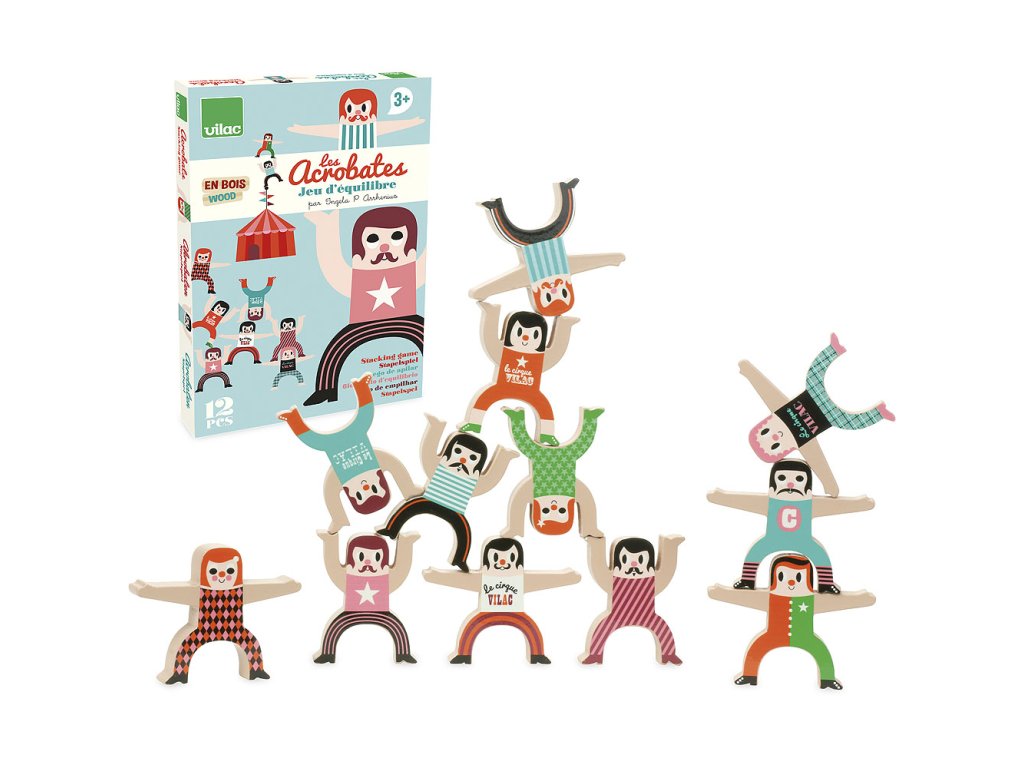 Dvanáct dřevěných figurek akrobatů, s kterými si můžete zahrát balanční hru. Jednoduše skládejte postavičky různě na sebe. Ten, komu akrobati spadnou, prohrál. Ilustrováno Ingelou P. Arrhenius. Hračky Vilac mají značku francouzské agentury ADEME, to znamená, že tyto dřevěné hračky jsou vyráběny ekologicky. Šetří životní prostředí, neznečišťují půdu, vodu a vzduch, neplýtvají energiemi. Již více než 100 let plní značka Vilac dětské sny. Společnost Vilac sídlí hluboko v srdci pohoří Jura, obklopena horami, jezery a lesy. Tato francouzská společnost vyrábí od roku 1911 dřevěné hračky v klasickém, starodávném stylu s moderními barvami a vzory. Hračky Vilac jsou jedinečné, nikdy nevyjdou z módy a dokáží okouzlit všechny generace. Vilac pomáhá utvářet dětskou představivost svými radostnými ilustracemi či dizajny a reinterpretací klasických hraček, které se jen tak neopotřebují. Děti dostávají na Vánoce a narozeniny spousty hraček, většina z nich je však nezaujme na dlouhou dobu, láska k hračce se nenaplní. Dřevěné hračky Vilac vzbuzují vášeň i o 50 let později, když jako dospělí náhodou najdete v podkroví hračky, které jste jako děti milovali. Vilac již 100 let propojuje děti s hračkami, které si oblíbí a váží si jich. A proč je děti tak milují? To zůstává tajemstvím firmy Vilac.Technické parametry se mohou kdykoli změnit bez předchozího upozornění. Uvedené obrázky slouží pouze k ilustrativním účelům.