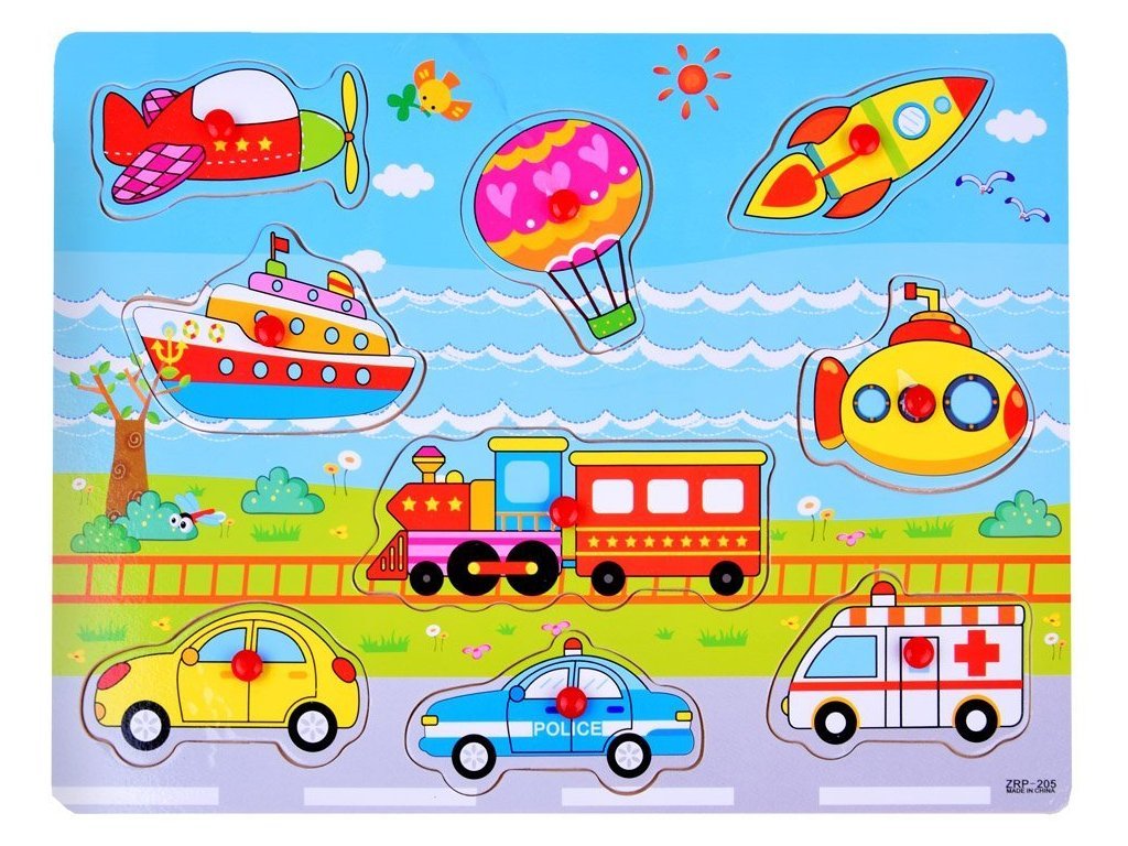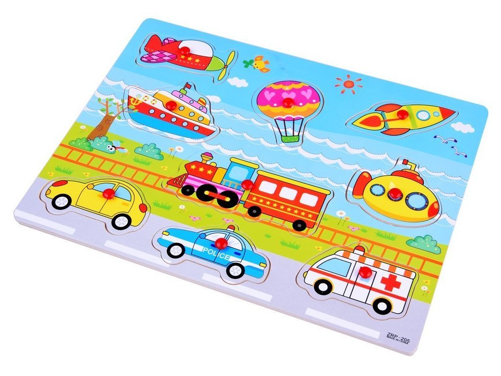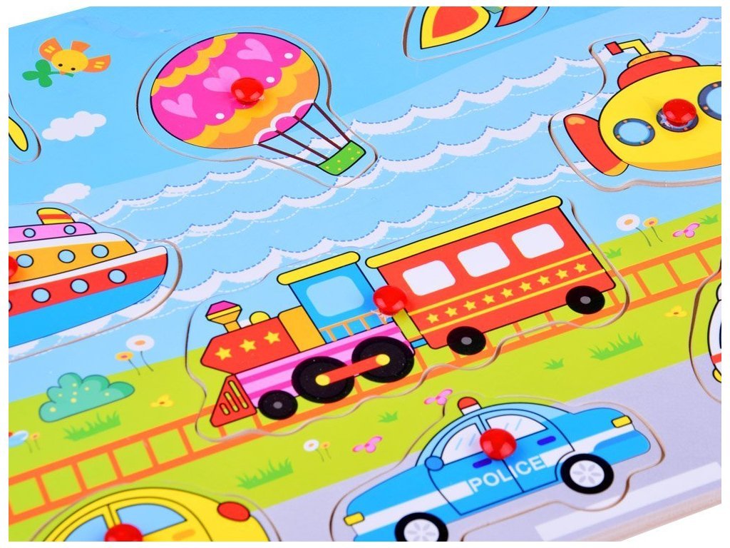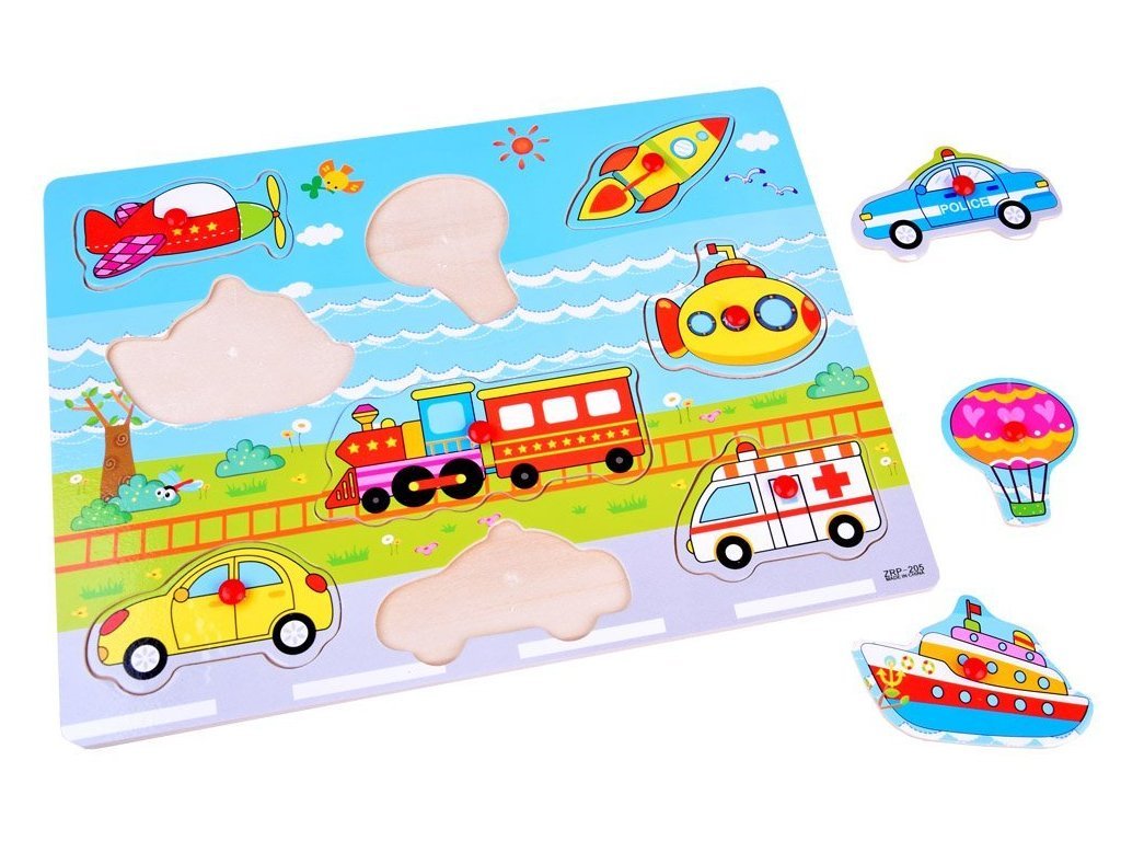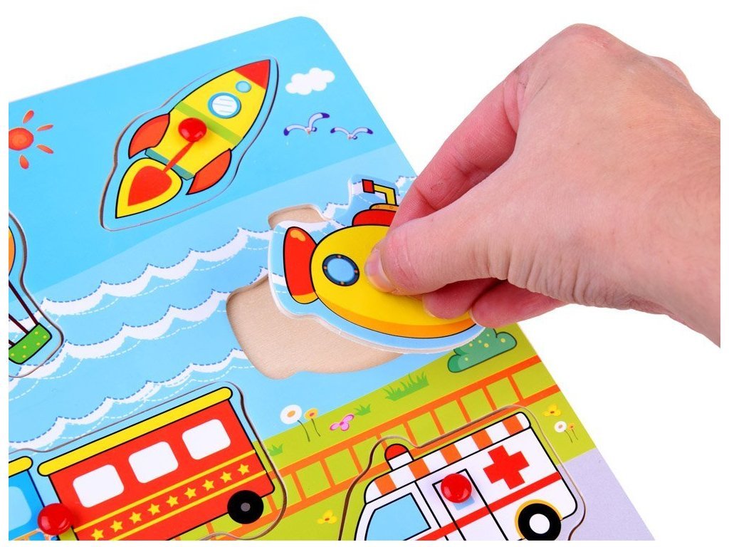 Vzdělávací dřevěné puzzle s vozidly jsou návrhem pro děti, které se chtějí naučit nové tvary, opakovat názvy jednotlivých dopravních prostředků a co je nejdůležitější cvičí během hry s prsty.
