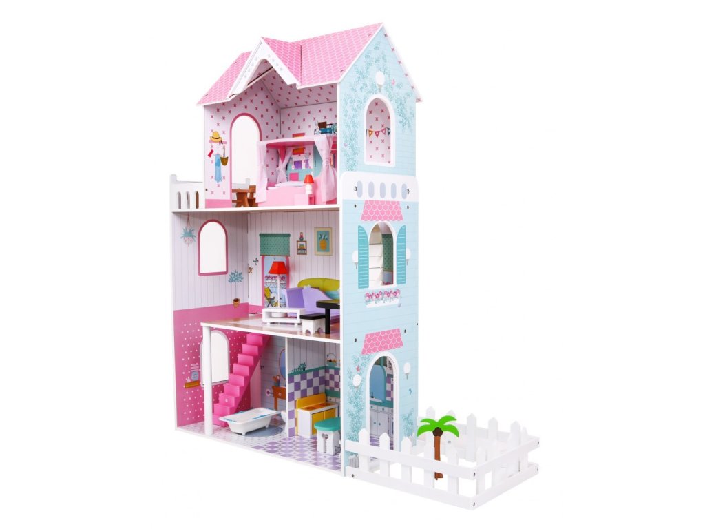 Jemné pastelové barvy a kvalitní zpracování, nejsou jedinou výhodou domečku, který má 3 patra. Poslouží Vám po dlouhá léta. Na prvním patře se nachází kuchyně s jídelnou, koupelna a schody na další patro. Na druhém patře se nachází obývací pokoj a opět schody. Třetí patro je ložnicí s terasou. Vedle domečku je krásný bílý plot.