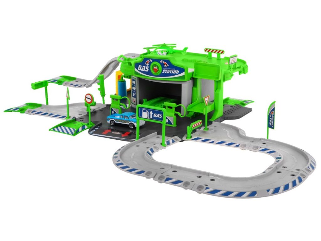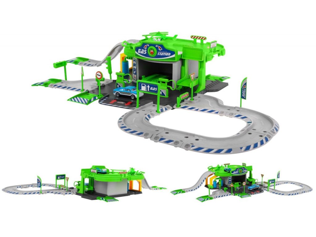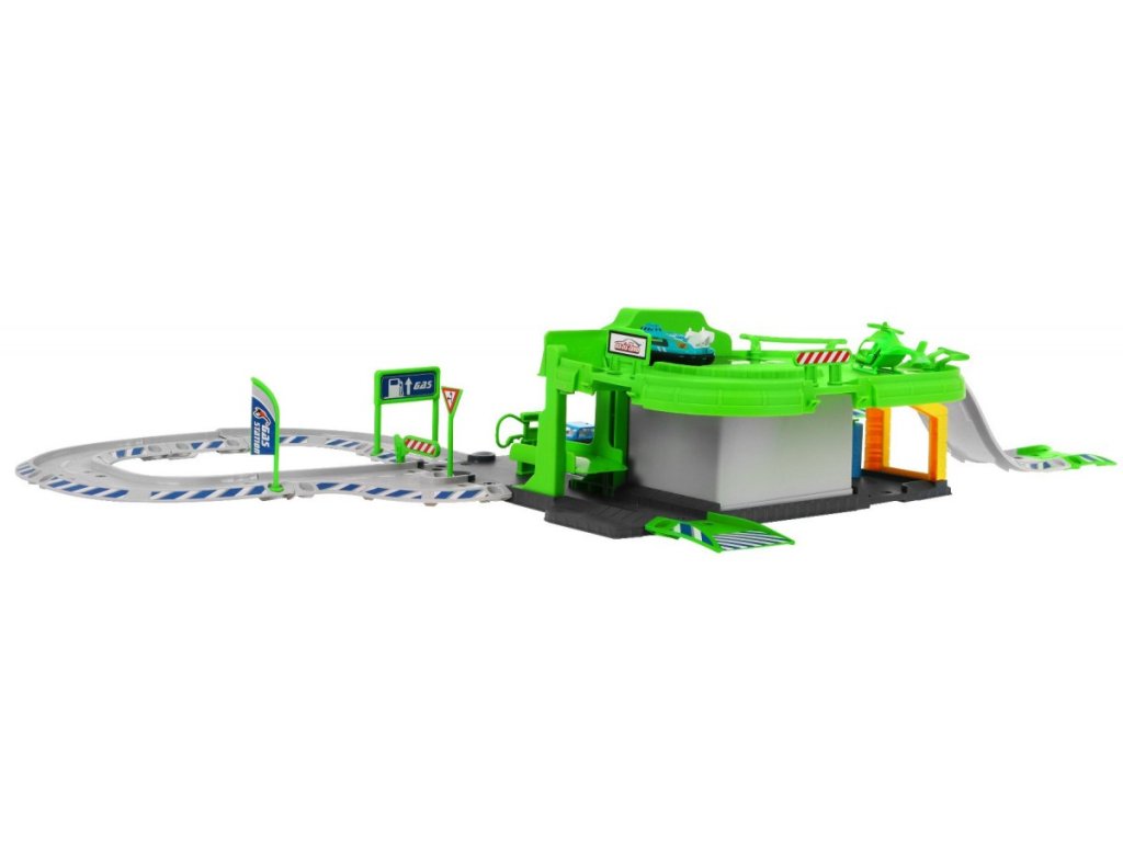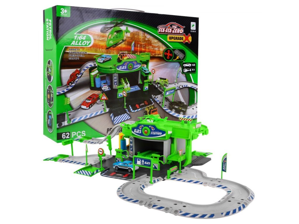 Vícepodlažní garáž s čerpací stanicí, vystřelovačem autíček, lodí a vrtulníků. Souprava garáže pro děti se skládá ze 62 prvků pro montáž.