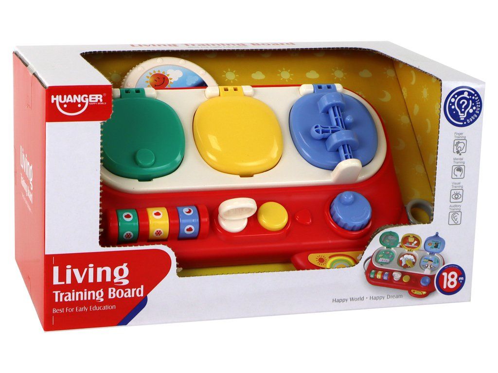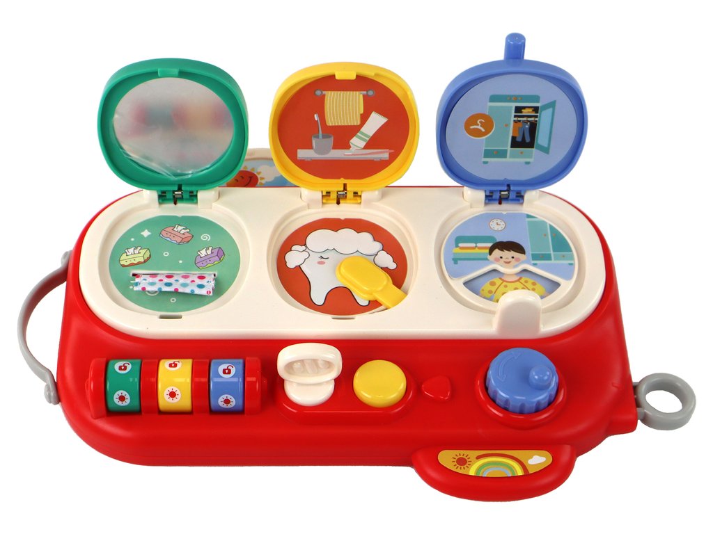 Vzdělávací hračka – Dětský hrací panel v intenzivní červené barvě skvěle kombinuje zábavu se vzděláváním, je ideální pro malé objevitele. Tato interaktivní tabule má tři otevírací dvířka, z nichž každé nabízí unikátní interaktivní zážitek: