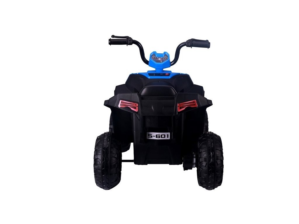 Modrá čtyřkolka S601 příslušenstvím je napájen baterií 6V4.5Ah, která v duetu s motorem 35W umožňuje radostné a pohodlné hraní. Tato kombinace činí zařízení velmi bezpečným pro děti a to, co je stejně důležité – nezpůsobí jim sebemenší potíže při jízdě sám. Dětský model je charakterizován třístupňovou automatickou převodovkou, intuitivním pedálem, který kombinuje funkci plynu a brzdy – zastaví se, když malý závodník sejme pedál z pedálu a tlačítko zapalování vozidla, díky kterému si pár let nemusí pamatovat na klíč zapalování.