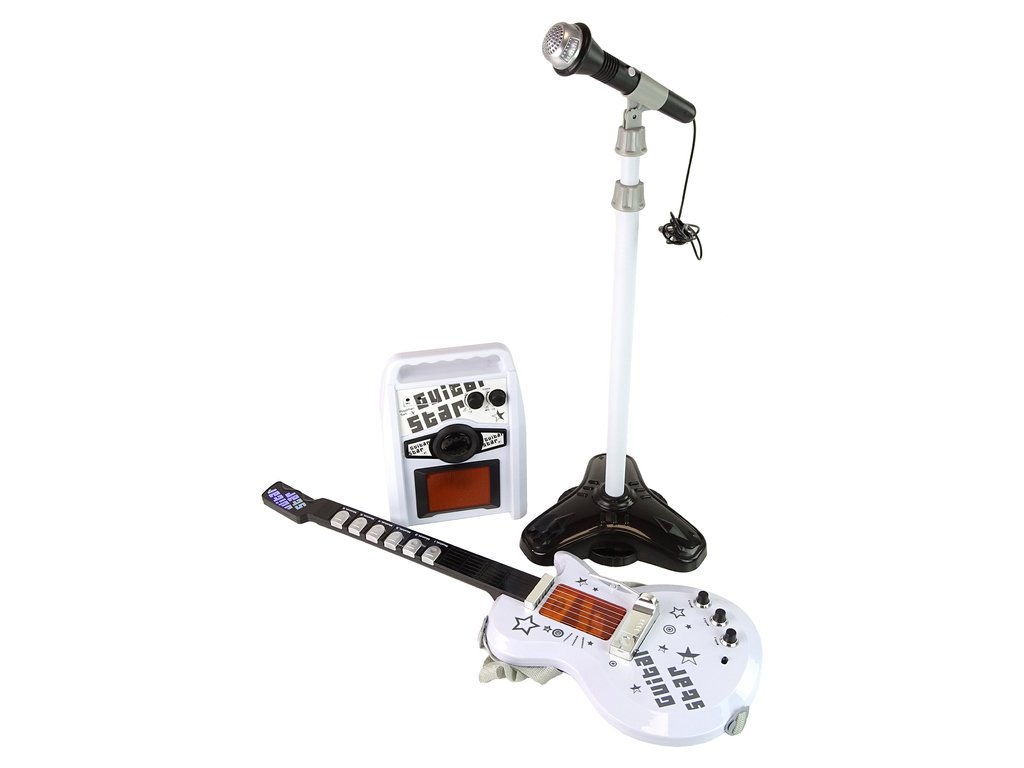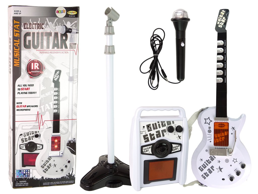 Tato realisticky vypadající kytara v bílé barvě děti jednoduše nadchne. Je napájena třemi bateriemi, umožňuje volnou hru a po zapnutí se rozsvítí, což jí dodává kouzlo a podněcuje představivost. Navíc ji lze připojit k telefonu, což umožňuje přehrávat oblíbenou hudbu a zpívat si s ní.