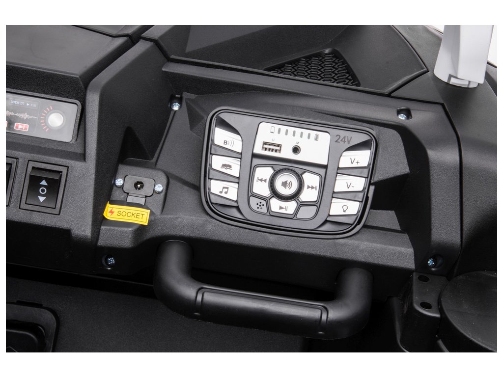 Hudební panel je vybaven vstupem pro USB, MP3, Bluetooth a nachází se zde tlačítka s předehranými melodiemi a klaksonem. Na cestu si posvítíte předními i zadními LED světly.