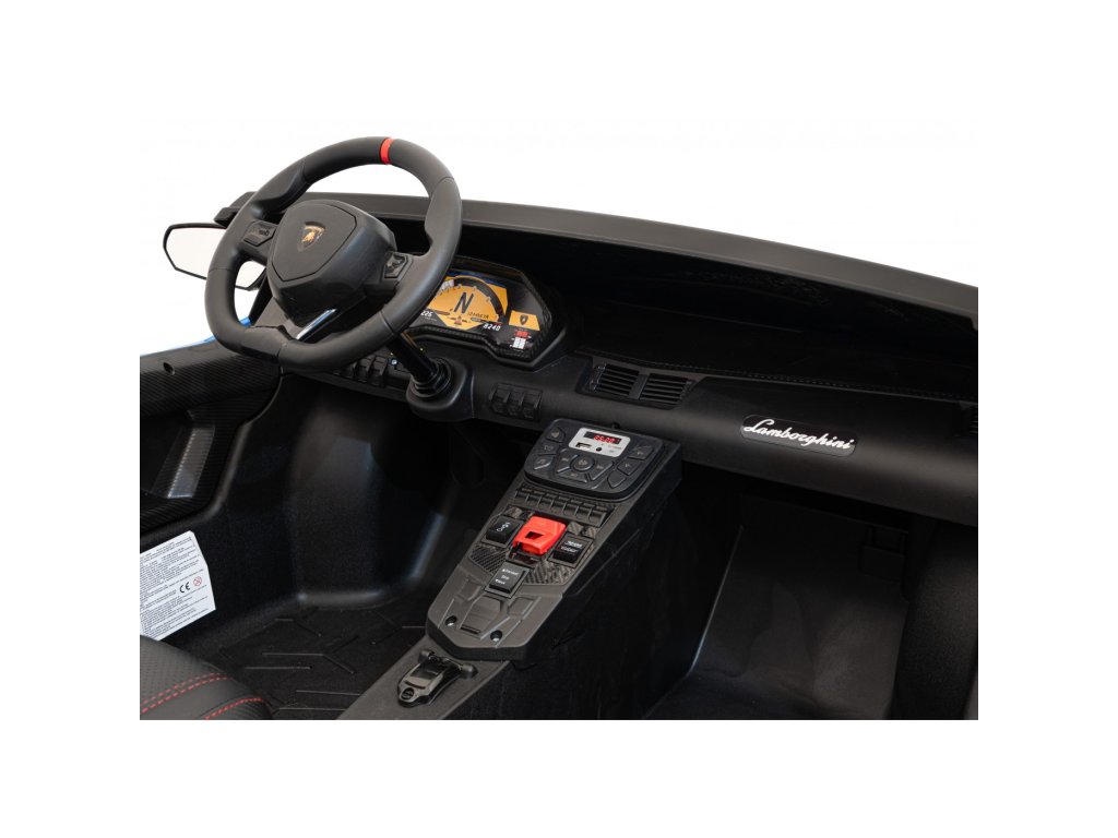 Dětské elektrické autíčko licencované společností Lamborghini je vybaveno exkluzivní sedačkou z ekologické kůže, hudebním panelem se vstupy MP3, USB, AUX a Bluetooth, tlačítky s předem nahranými melodiemi a předními i zadními LED světly. Při startování uslyšíte charakteristické zvuky motoru.
