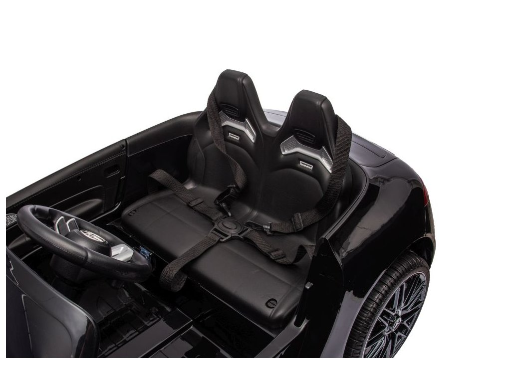 Dětské licencované autíčko Mercedes AMG SL63 přijíždí na měkkých pěnových EVA kolech, která jsou tichá a přizpůsobí se různým typům terénu. Dítě se posadí do pohodlně tvarované sedačky z ekologické kůže a o bezpečnost se postarají bezpečnostní pásy.