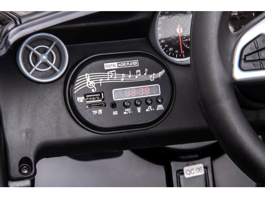 Autíčko má pohodlnou sedačkou z měkké ekologické kůže, která má bezpečnostními pásy. Dále je vybaveno hudebním panelem se vstupy MP3 a USB, a má předehrané melodie. Vozítko má přední a zadní LED osvětlení.