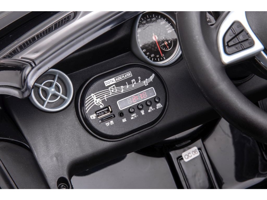 Autíčko má pohodlnou sedačkou z měkké ekologické kůže, která má bezpečnostními pásy. Dále je vybaveno hudebním panelem se vstupy MP3 a USB, a má předehrané melodie. Vozítko má přední a zadní LED osvětlení.