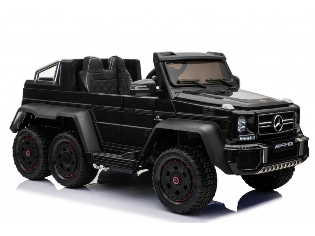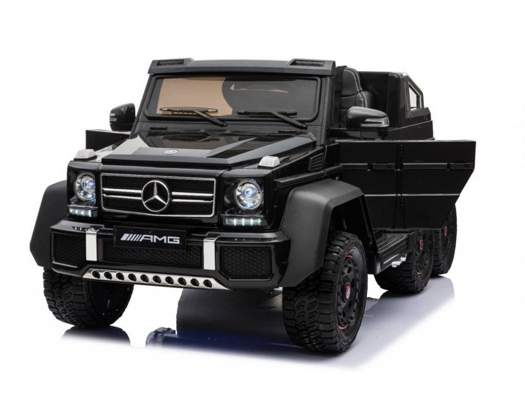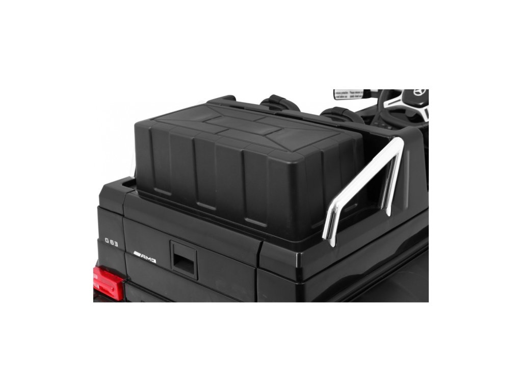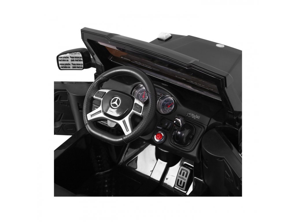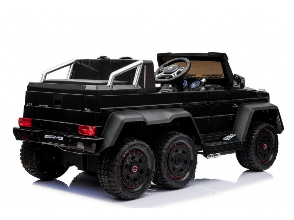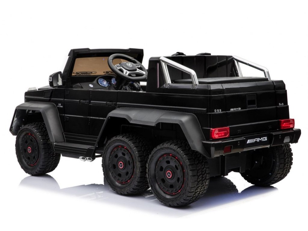 Elektrické autíčko Mercedes G63 má šest výkonných elektrických motorů s výkonem 45W, baterií 12V 14Ah a navíc má nosnost až 110 kg. O pohodlnou jízdu se postará šest velkých pěnových EVA kola. Dítěti jízdu určitě zpříjemní hudební panel s MP3, FM rádiem, předehrané melodie, možnost připojení se přes Bluetooth a vstupy pro USB, Micro USB a AUX. Na volantu se nachází klakson. Sedadlo je vyrobeno z černé ekologické kůže.