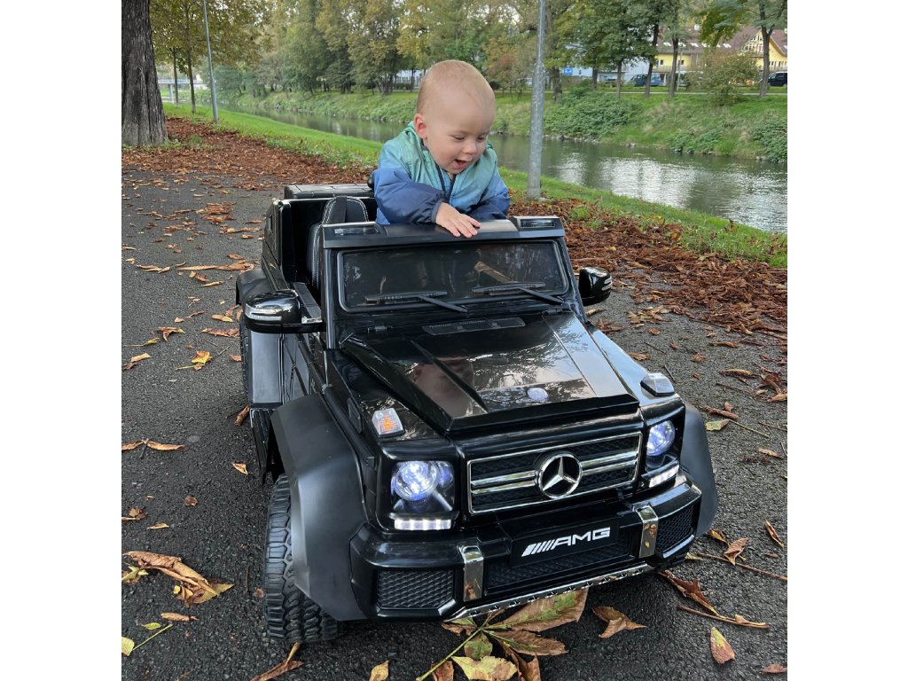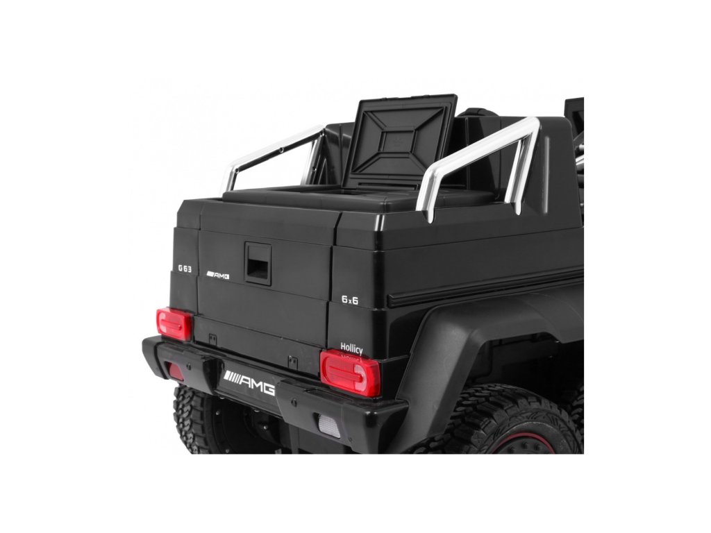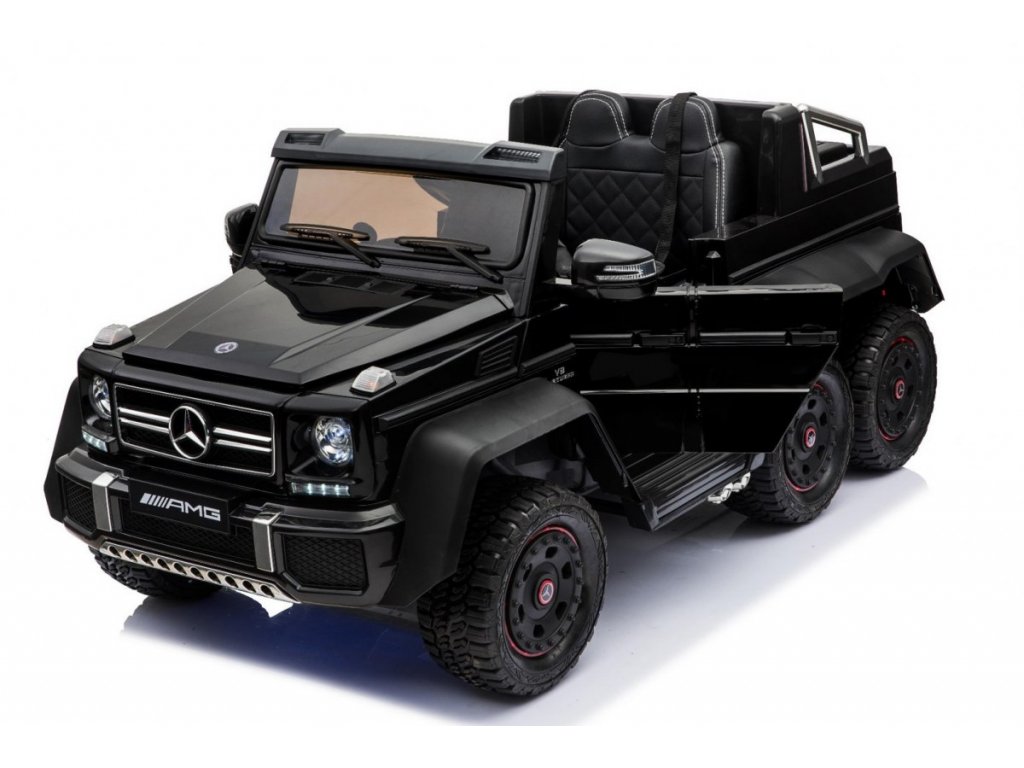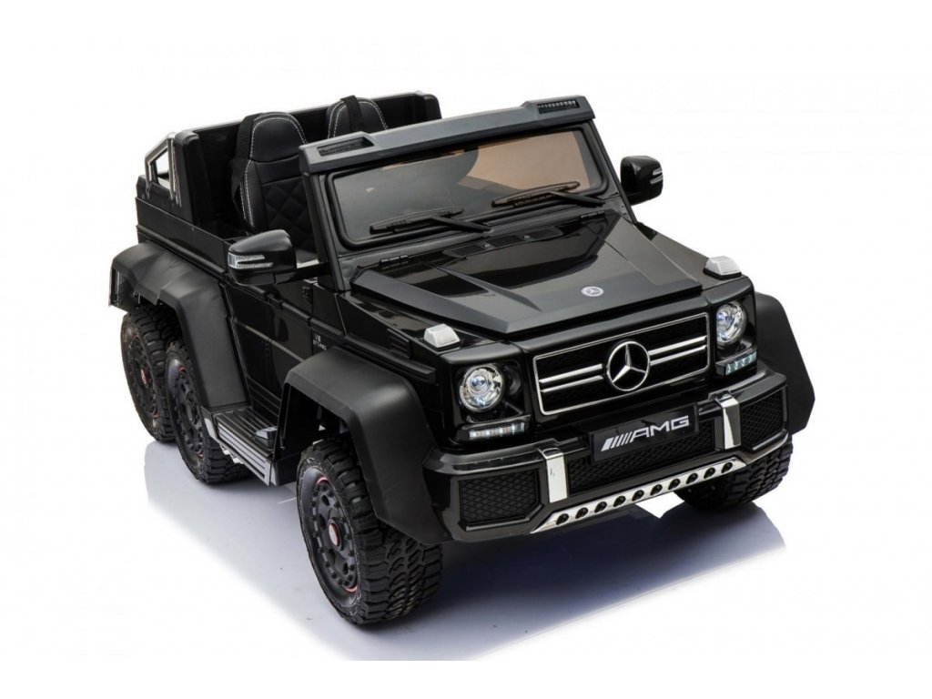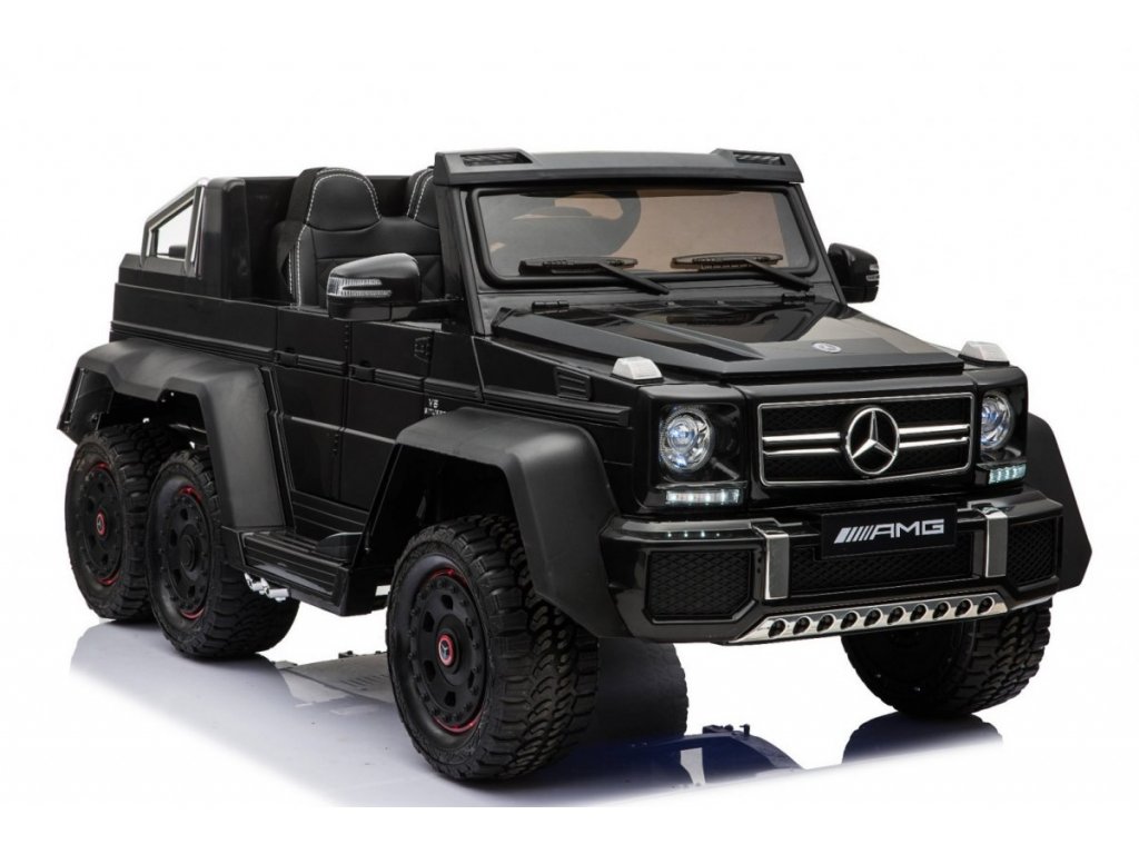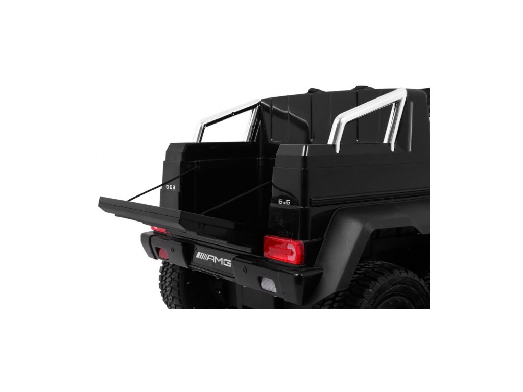 Elektrické autíčko Mercedes G63 má šest výkonných elektrických motorů s výkonem 45W, baterií 12V 14Ah a navíc má nosnost až 110 kg. O pohodlnou jízdu se postará šest velkých pěnových EVA kola. Dítěti jízdu určitě zpříjemní hudební panel s MP3, FM rádiem, předehrané melodie, možnost připojení se přes Bluetooth a vstupy pro USB, Micro USB a AUX. Na volantu se nachází klakson. Sedadlo je vyrobeno z černé ekologické kůže.