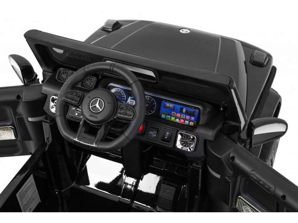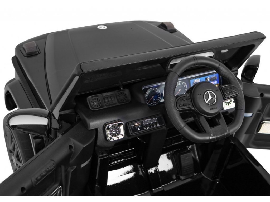 Mercedes G63 AMG je skutečnou kombinací spolehlivosti a špičkové kvality. Toto vozidlo bude sloužit jak při každodenních jízdách v parku, tak během víkendových výletů mimo město. Dva 45W motory v kombinaci s 12V 7Ah baterií, umožňují jízdu rychlostí 3 až 5 km / h, což jistě zapůsobí na malého řidiče.