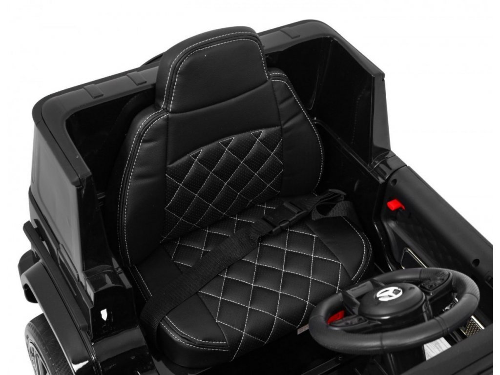 Uvnitř Mercedesu je měkké sedadlo z ekologické kůže s nastavitelnými bezpečnostními pásy a osvětlená palubní deska. K dispozici je otočný volant, napodobeniny indikátorů, včetně tachometru, hudební přehrávač s vstupem USB.