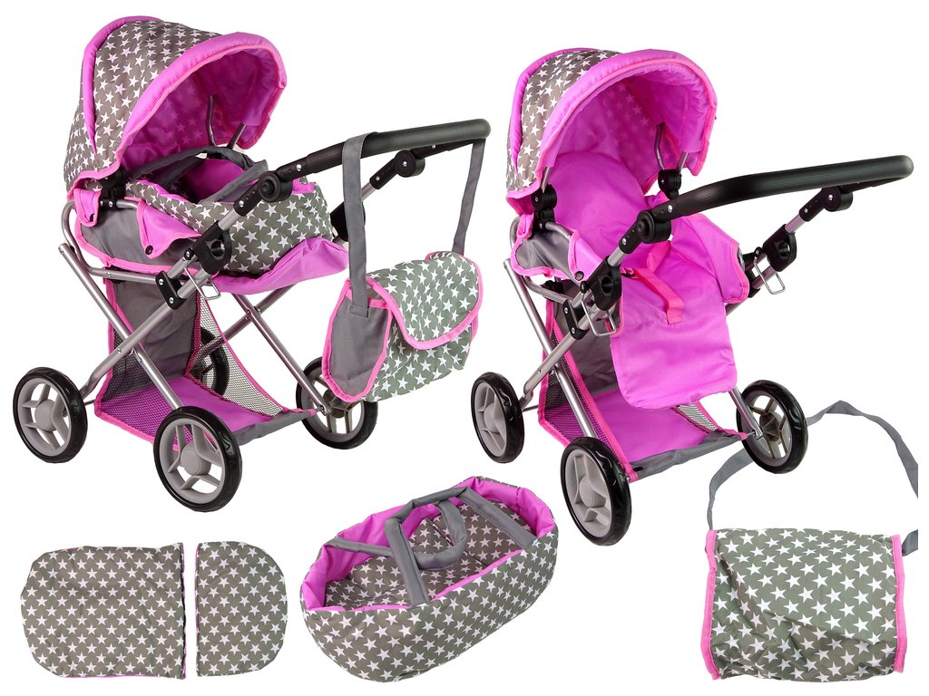 Holčičí kočárek 2 v 1 s taškou Šedý Růžový Hvězdičky