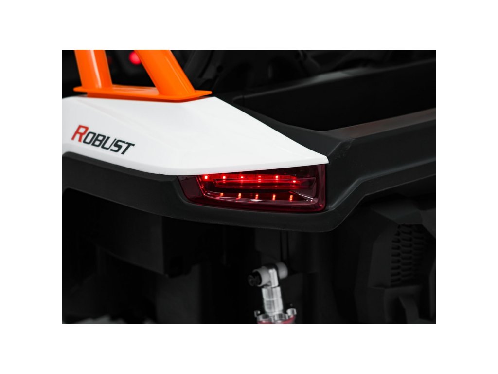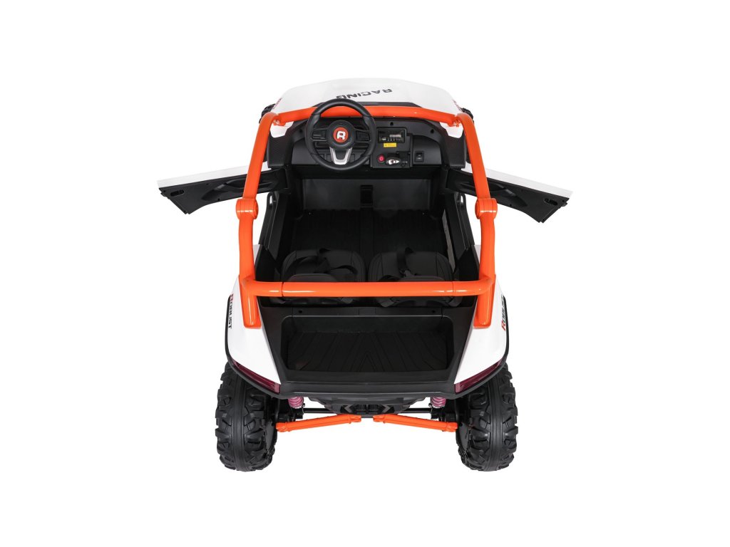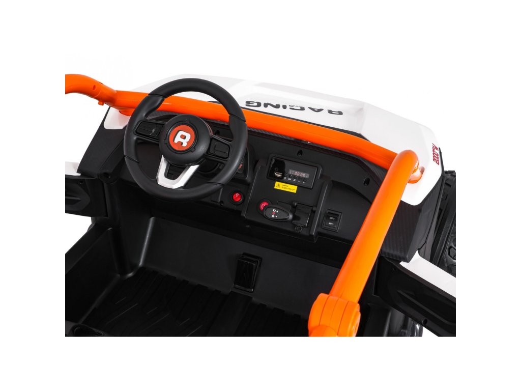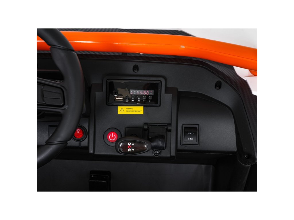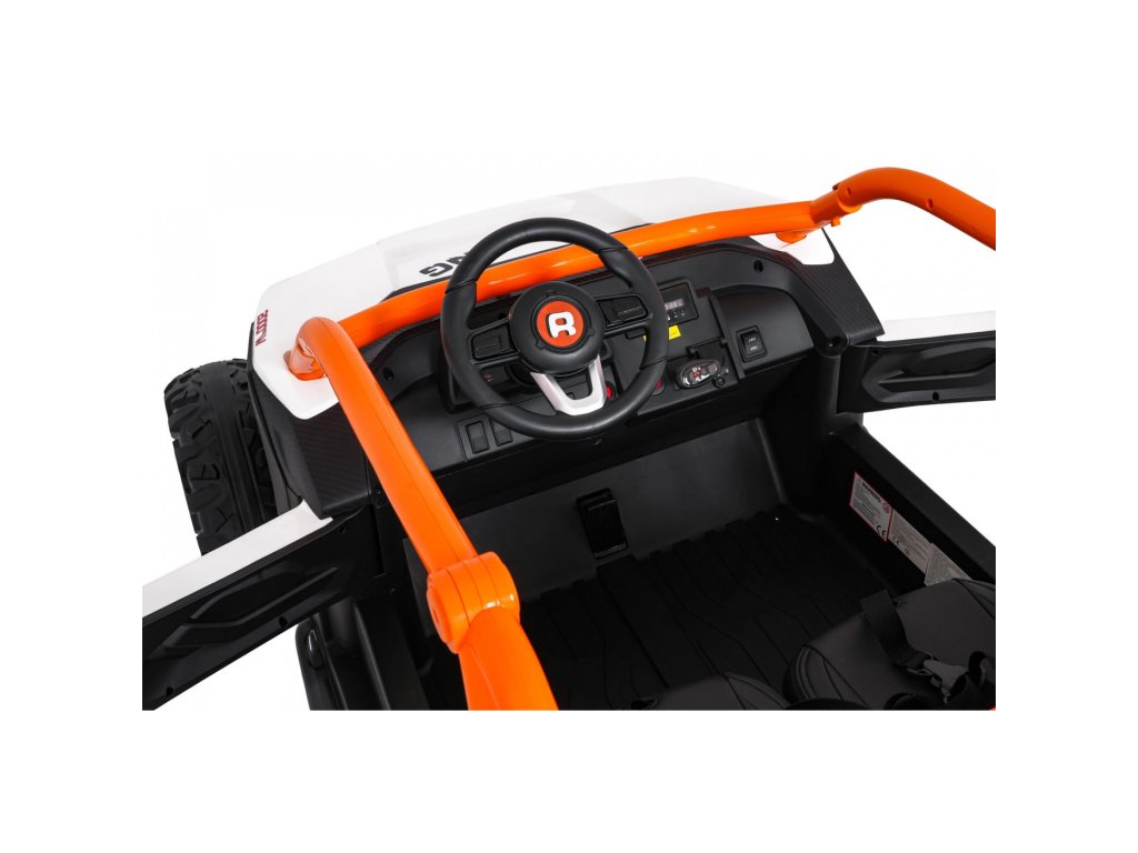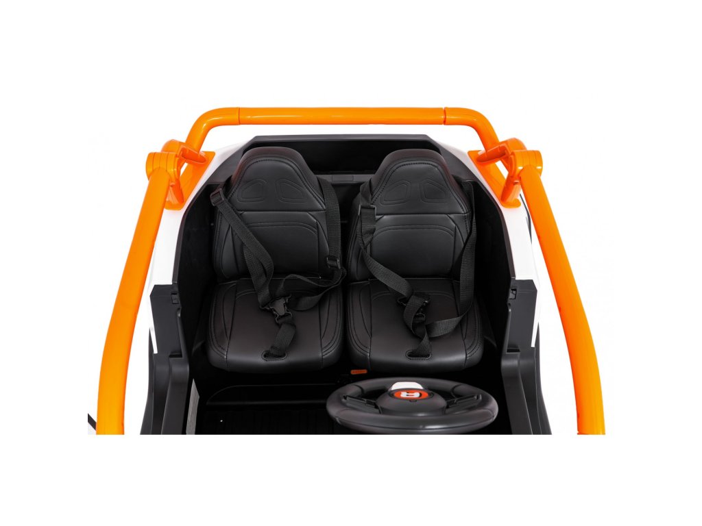 Dvě samostatné sedačky potažené ekokůží jsou vybaveny bezpečnostními pásy a umožňují jízdu dvěma dětem současně. Otevíratelné dveře s bezpečnostní pojistkou zajišťují snadné a bezpečné nastupování. LED světla vpředu i vzadu, realistické zvuky motoru a další audio efekty přinášejí autentický zážitek z jízdy. Multimediální panel umožňuje připojení přes USB, AUX i MP3, nechybí ani FM rádio a ovládací tlačítka na volantu.