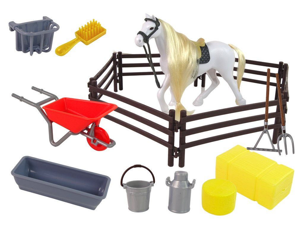 Sada se skládá z figurky koně s dlouhou hřívou, která je ideální pro česání a zaplétání. Kromě toho sada obsahuje doplňky nezbytné pro každodenní život a udržování pořádku ve stáji, jako je trakař a hrábě. To však není vše, musíte se postarat o to, aby měl kůň co jíst a pít, k tomu budete potřebovat napáječky a seno. Místo, kde budou mít koně svůj výběh, označíte speciálním plotem.