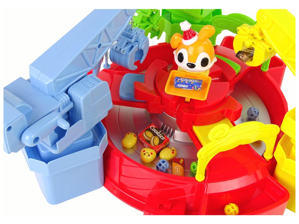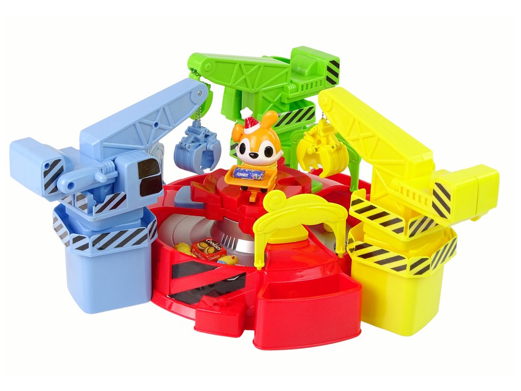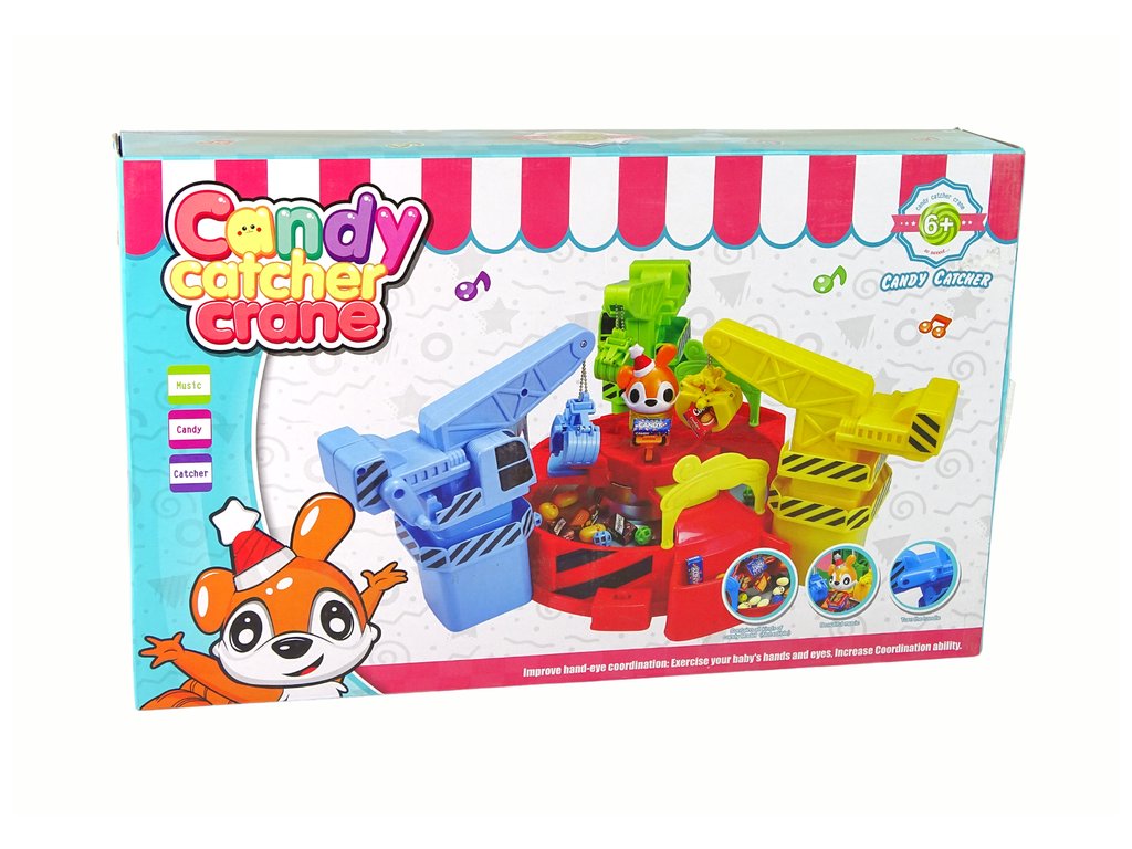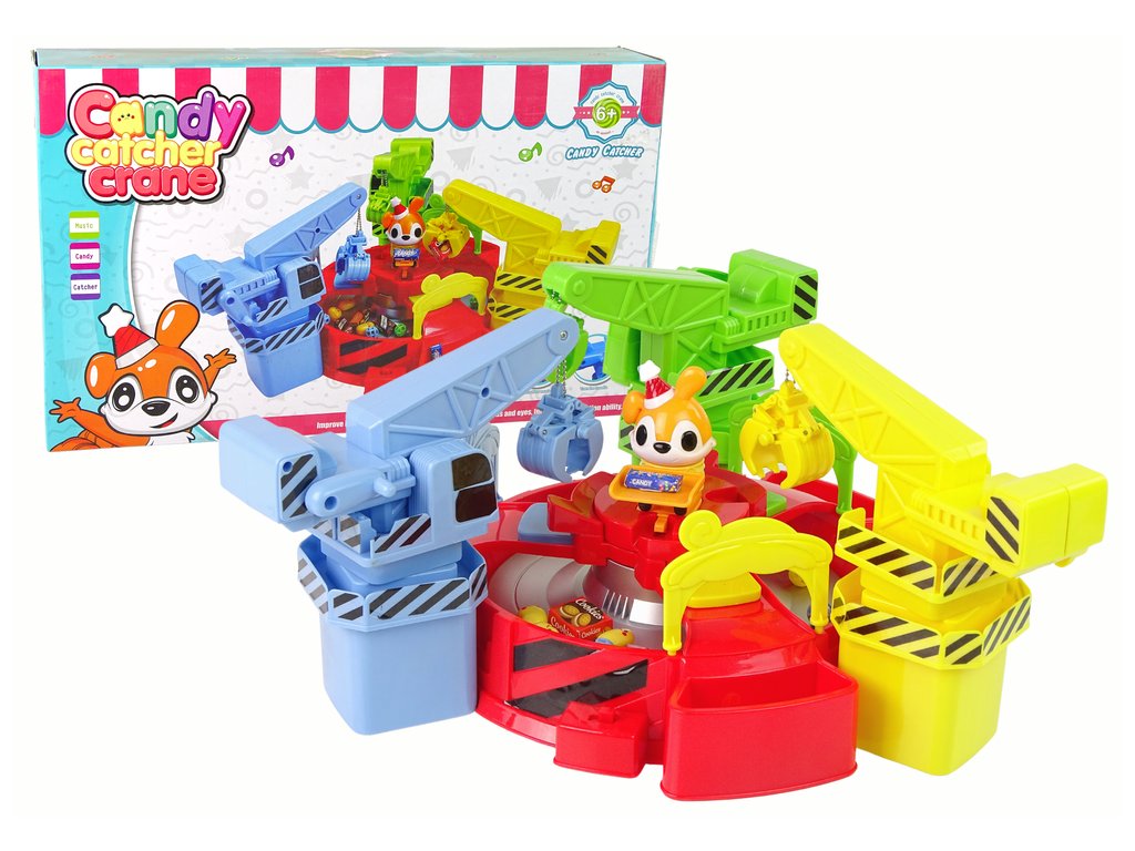 Středobodem hračky je otočný kolotoč, na kterém se pohybují přiložené atrapy bonbonů. Samozřejmě je můžete sami nahradit oblíbenými sladkostmi Vašich dětí! Kolem kolotoče jsou tři jeřáby v zelené, modré a žluté barvě. Jeřáby jsou ovládány klikou, která umožňuje spuštění lapače.