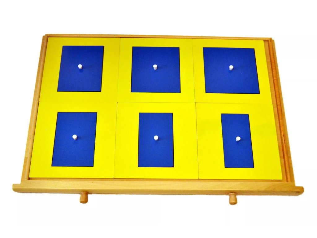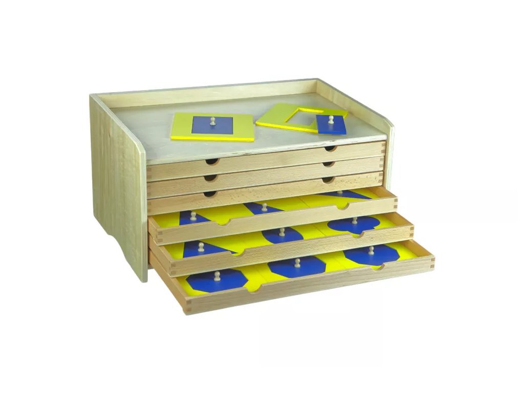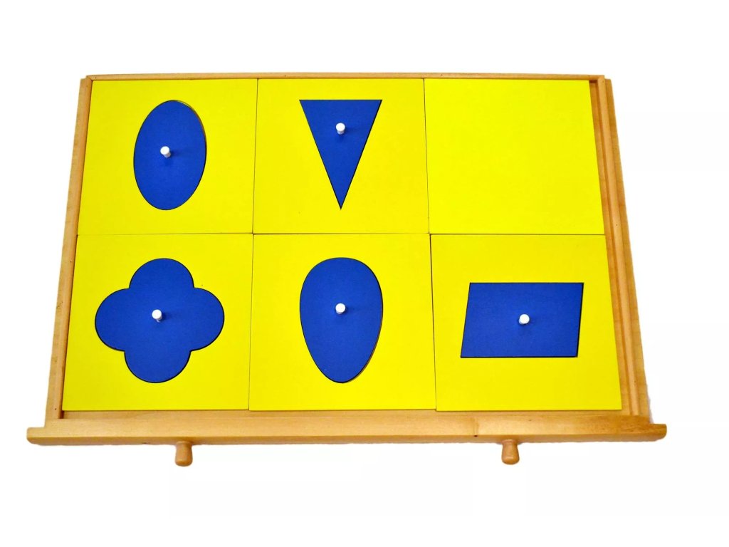 Montessori pomůcka obsahuje 6 zásuvek se 35 rovinnými tvary v párech: tvar a odpovídající rámeček. Každý tvar má uprostřed úchyt pro snadnější manipulaci. Prezentační podnos obsahuje tři základní tvary: trojúhelník, kruh a čtverec.