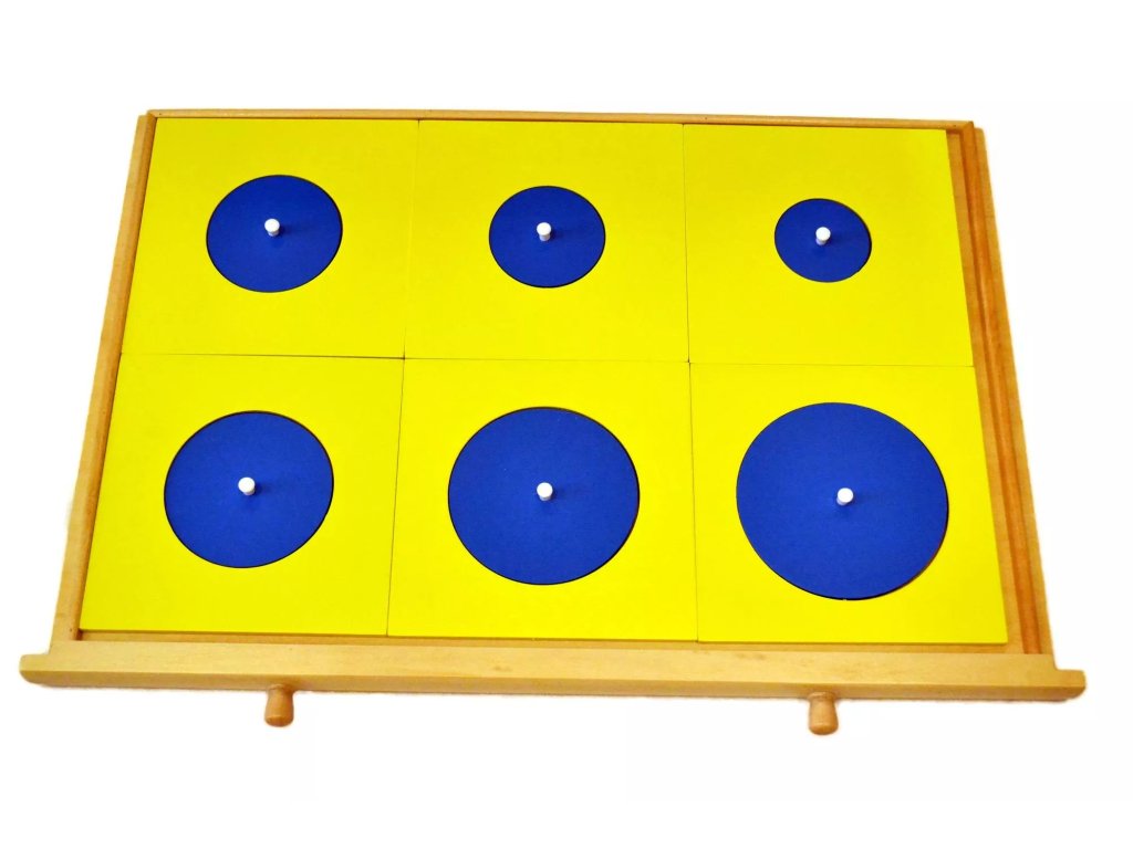 Nechte dítě vybrat podnos (1 nebo 2) a přinést ho na kobereček. Podnos položte do horního levého rohu koberečku. Dítě vyjme první tvar nedominantní rukou, obkrouží ho dvěma prsty dominantní ruky (prsty, které se používají při psaní) a položí na kobereček. Stejně postupuje s dalším tvarem. Pokud dítě tvary pouze vyndává a pokládá, nenucujte obkroužování. Tvary jsou na koberečku neuspořádané; můžete demonstrovat řazení od největšího po nejmenší nebo porovnávání přikládáním na sebe. Po seřazení prvních dvou položek přenechte další činnost dítěti. Po dokončení vracejte tvary zpět do rámů zleva doprava a poté pomůcku uložte.