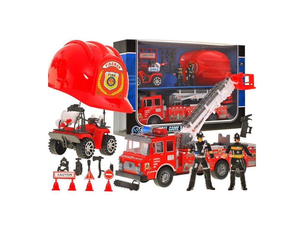 Úžasný set hasičského auta, helmy, figurek a hasičské čtyřkolky je skvělý pro všechny milovníky hasičů! Hračka je z certifikovaných materiálů a hasičská přilba se bude hodit i jako přestrojení na maškarní ples!
