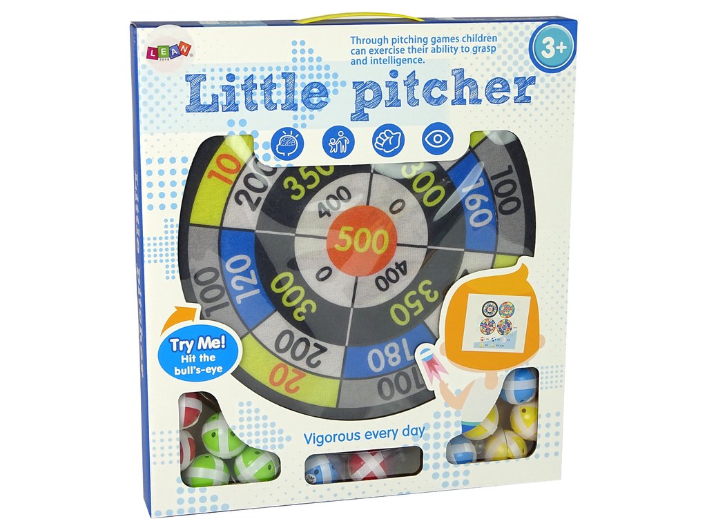 Herní sada 12 míčků a terče s průměrem 36 cm. Klasická šipková hra v bezpečné verzi pro děti. Poskytuje nádhernou a bezpečnou hru. Dokonale trénuje obratnost a přesnost dítěte. Dokonale ovlivňuje správný vývoj koordinace očí a rukou.