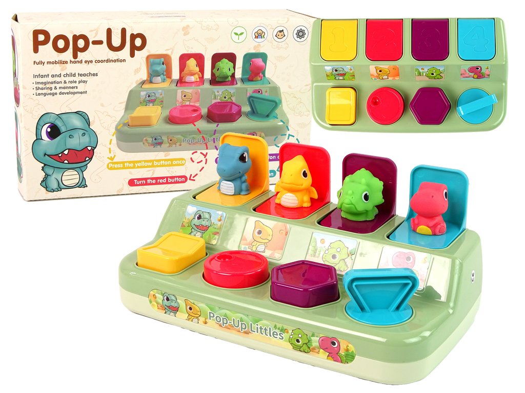 Zručnostní hračka Pop-Up s dinosaury je skvělá zábava pro batolata, která podporuje manuální a vizuální dovednosti. Po stisknutí nebo otočení správného tlačítka se objeví barevní dinosauři, což děti baví a zároveň je učí rozpoznávat barvy i tvary. Hračka rozvíjí dětskou zručnost, koordinaci a zvídavost.