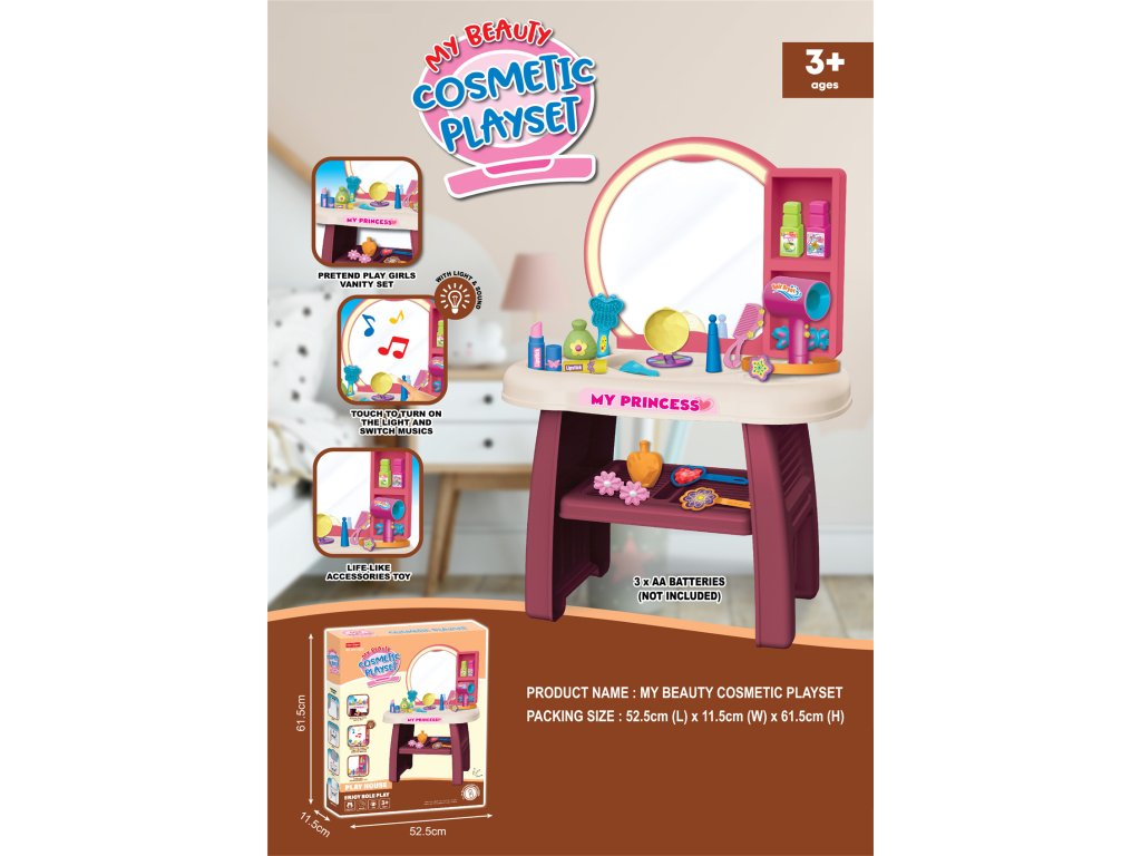 Kosmetický stolek má stabilní konstrukci a prostornou pracovní plochu. Součástí je fén, kartáč, hřeben, rtěnka, parfémy, doplňky a další tematické hračky. Děti mohou napodobovat líčení, česání a každodenní péči – to vše bezpečnou herní formou.