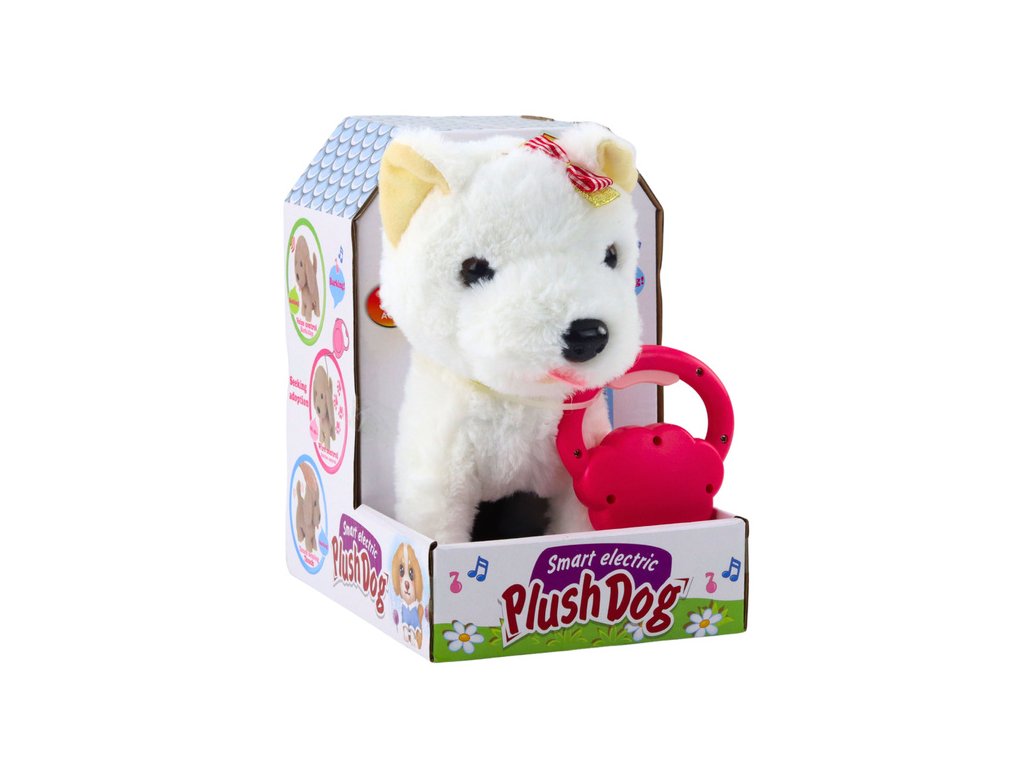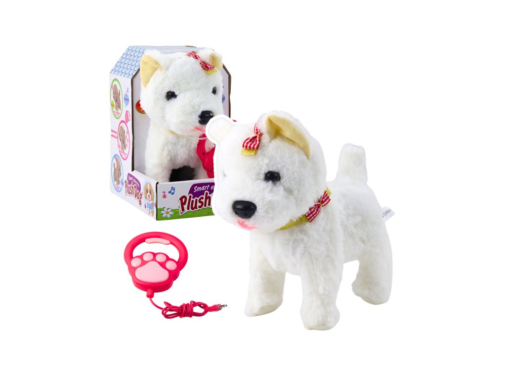Interaktivní pes s mašlí na vodítku bílý