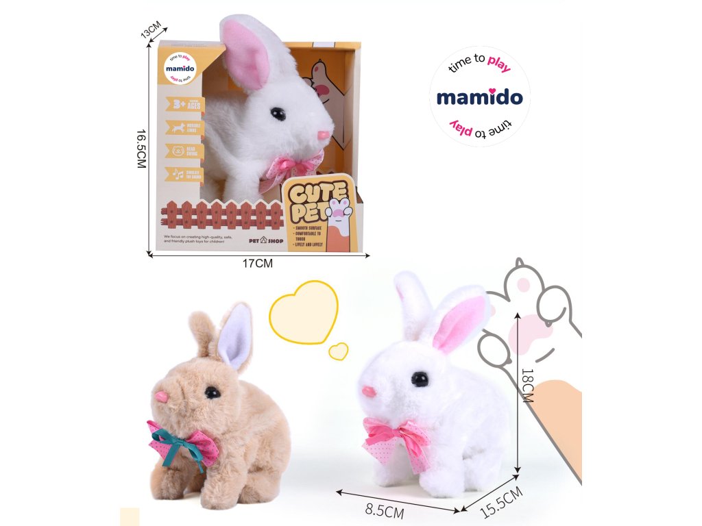Roztomilý plyšový králíček z řady Cute Pet okouzlí na první pohled. Hebký povrch je příjemný na dotek a králíček působí jako živý. Po zapnutí začne pohybovat tlapkami, kývat hlavou a doprovází to zvukem – takže hra je mnohem realističtější a zábavnější.