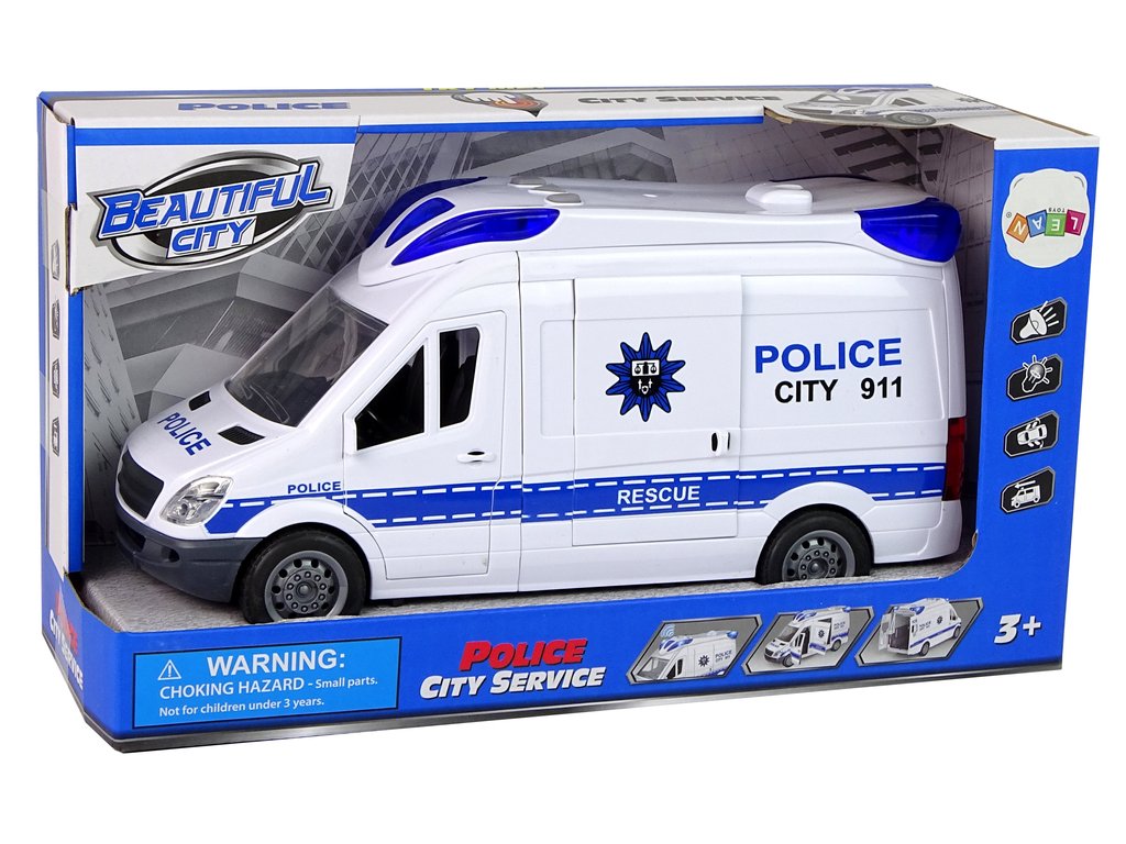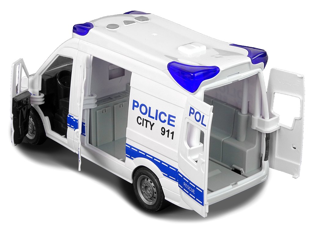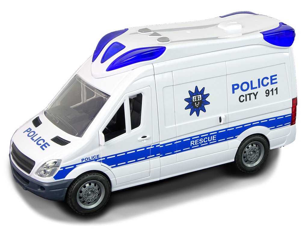Policejní auto se sirénou a modrými blikajícími světly. Auto je vyrobeno z plastu, v barvách odpovídajících policejním vozům. Vůz má integrovaný mechanismus na přední kola, takže jezdí samostatně. Zvukové a světelné efekty aktivujete pomocí tlačítek na střeše.
