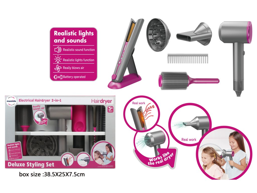 Tento dětský stylingový set obsahuje fén, žehličku na vlasy a doplňky, díky kterým se děti mohou cítit jako skuteční kadeřníci. Fén fouká vzduch, vydává realistické zvuky a svítí, zatímco žehlička simuluje hřejivý efekt – vše na baterie.