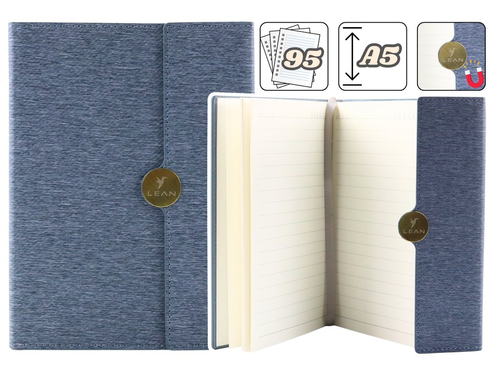 Elegantní kancelářský zápisník formátu A5 s magnetickým uzávěrem a šedým potahem spojuje styl a funkčnost. Jeho pevné magnetické zapínání chrání obsah před nechtěným otevřením a znečištěním, zatímco vysoce kvalitní tvrdý potah zajišťuje dlouhou životnost.
