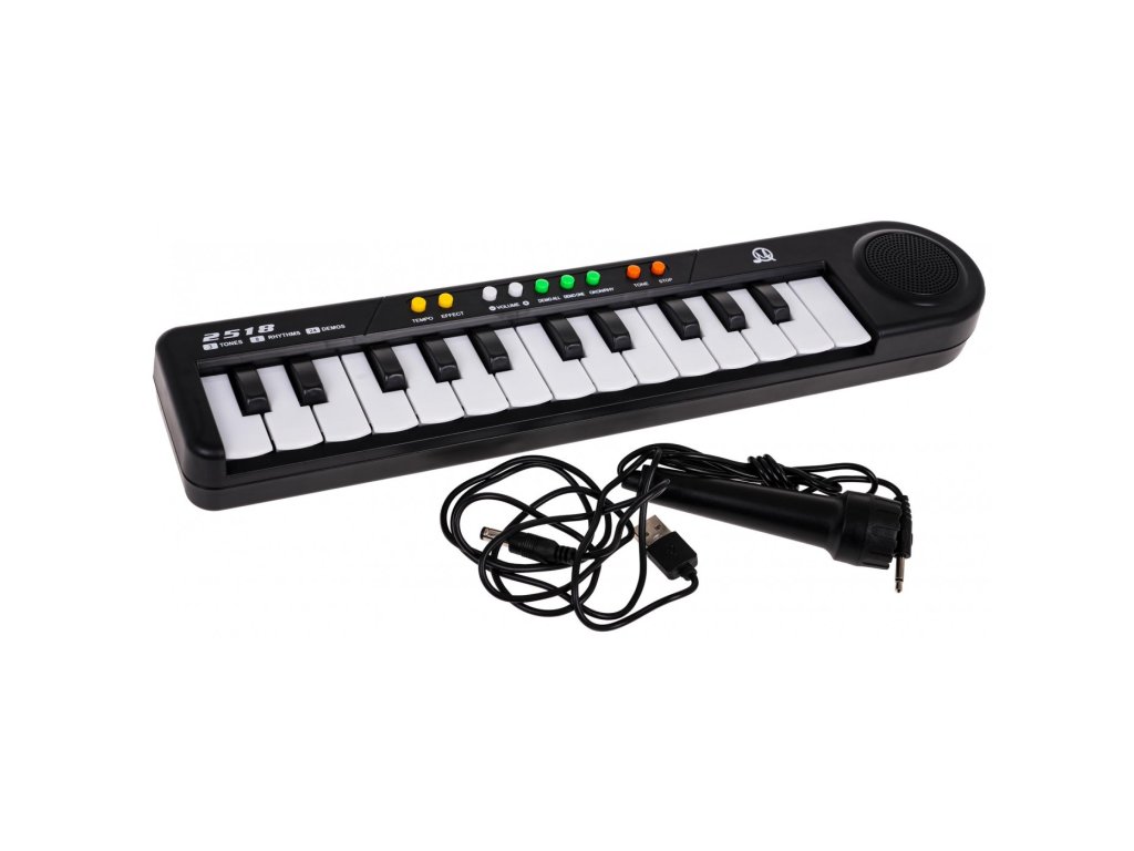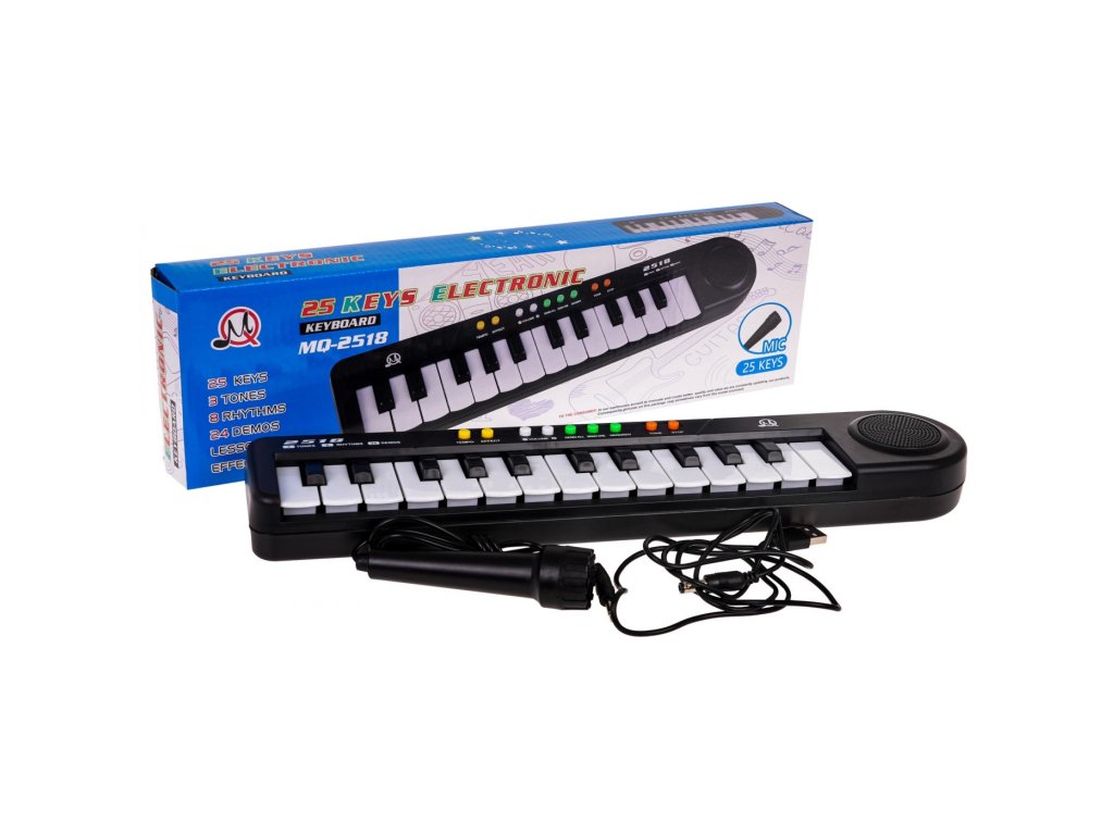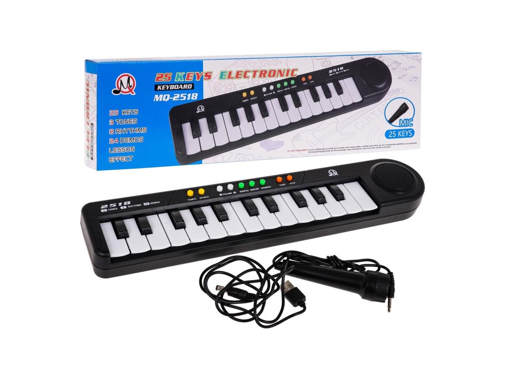 Klávesnici lze napájet pomocí přiloženého napájecího adaptéru USB nebo 3 baterií AA, takže je pohodlná a přenosná. Součástí balení je také mikrofon, který umožňuje malým umělcům zpívat a skládat vlastní písničky.