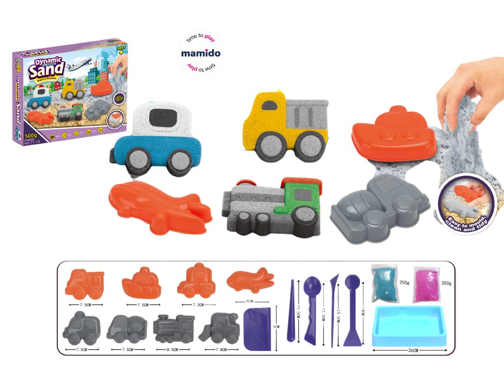 - Obsah balení: kinetický písek, 8 formiček dopravních prostředků, 5 nástrojů, podložka