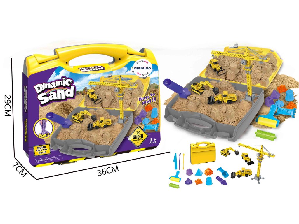 - Obsah balení: kufřík, kinetický písek, formičky, nástroje, jeřáb, stavební auta