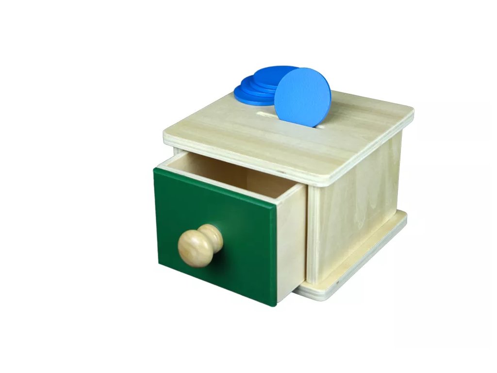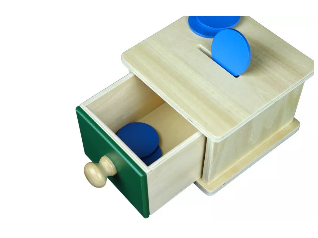 Dítě vhazuje modrý žeton do otvoru a následně jej po otevření šuplíku najde uvnitř. Jednoduchý mechanismus podporuje opakované cvičení a porozumění posloupnosti činností.