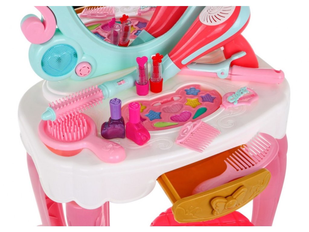 Bohatě vybavená sada kosmetického stolku s doplňky je návrhem pro malé princezny od 3 let. Hračka má zvukové a svítící efekty. Kosmetický stoleček je napájen 5 AA bateriemi - nejsou součástí balení.