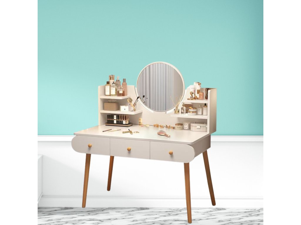 Tři hluboké, prostorné zásuvky usnadňují ukládání kosmetiky, šperků a vlasových či manikúrních doplňků - vše potřebné máte na dosah ruky. Otevřený prostor na desce a boční police umožňují praktické uspořádání často používaných produktů a zároveň dodávají toaletnímu stolku dekorativní nádech.
