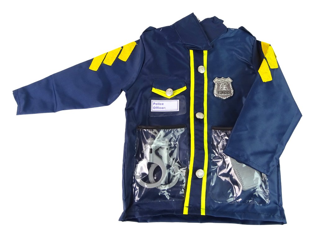 - Policejní uniforma s imitací knoflíků a nápisem POLICE na zádech, která se zapíná na suchý zip