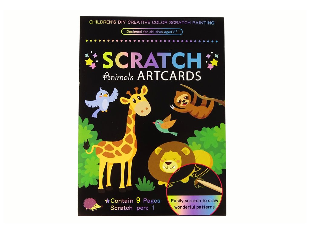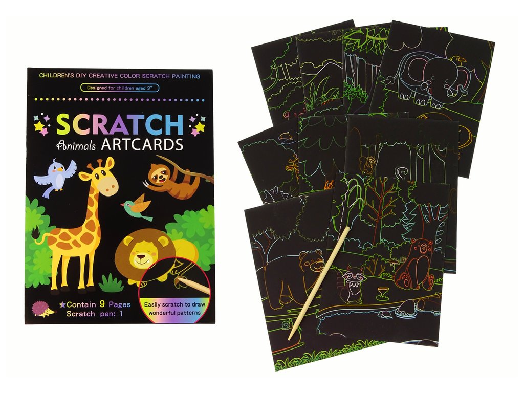 V sadě najdete 9 obrázků k seškrabání. Zábava je jednoduchá: pomocí speciální dřevěné špejle můžete z obrázku seškrabat černou vrstvu a odhalit krásné a barevné ilustrace.