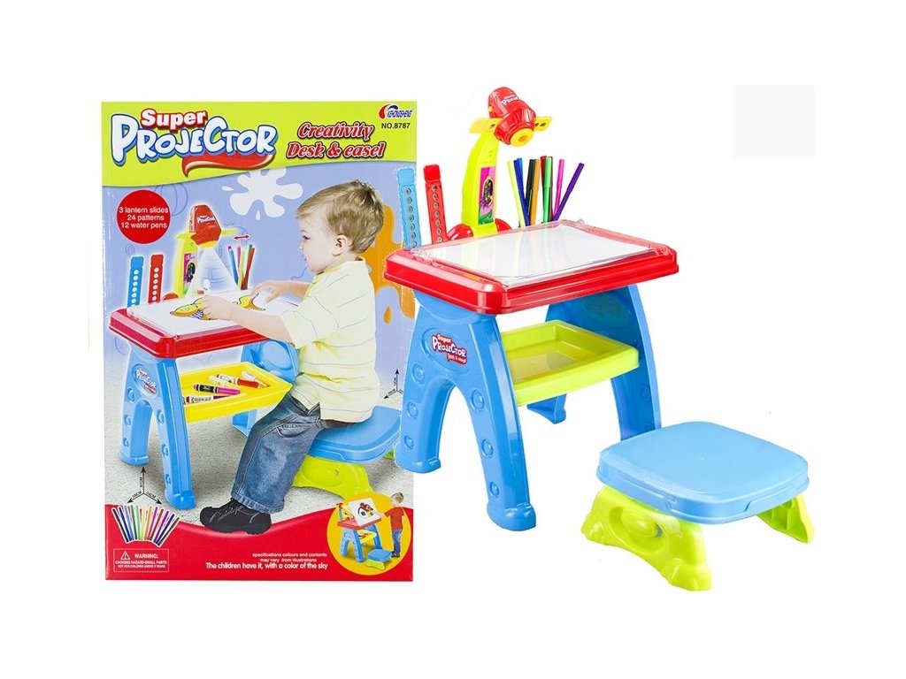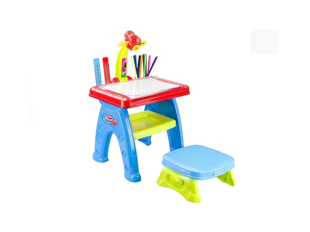 Stůl s projektorem, který splní sny každého dítěte. Stačí vložit do projektoru disk se snímky, nastavit vybraný výkres a zapnout projektor. Vzorek se zobrazí na prosvětlené ploše projektoru, díky které mohou děti vymalovávat nebo obkreslovat obrázky. Nádherně rozvíjí představivost a zabaví děti na celé hodiny.