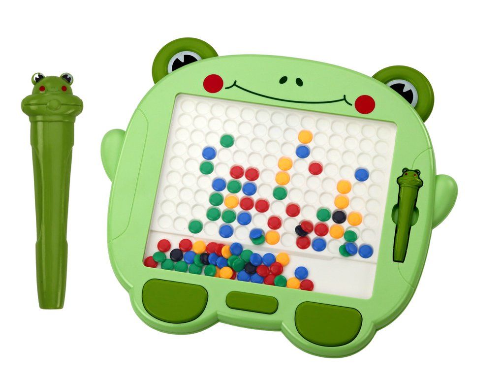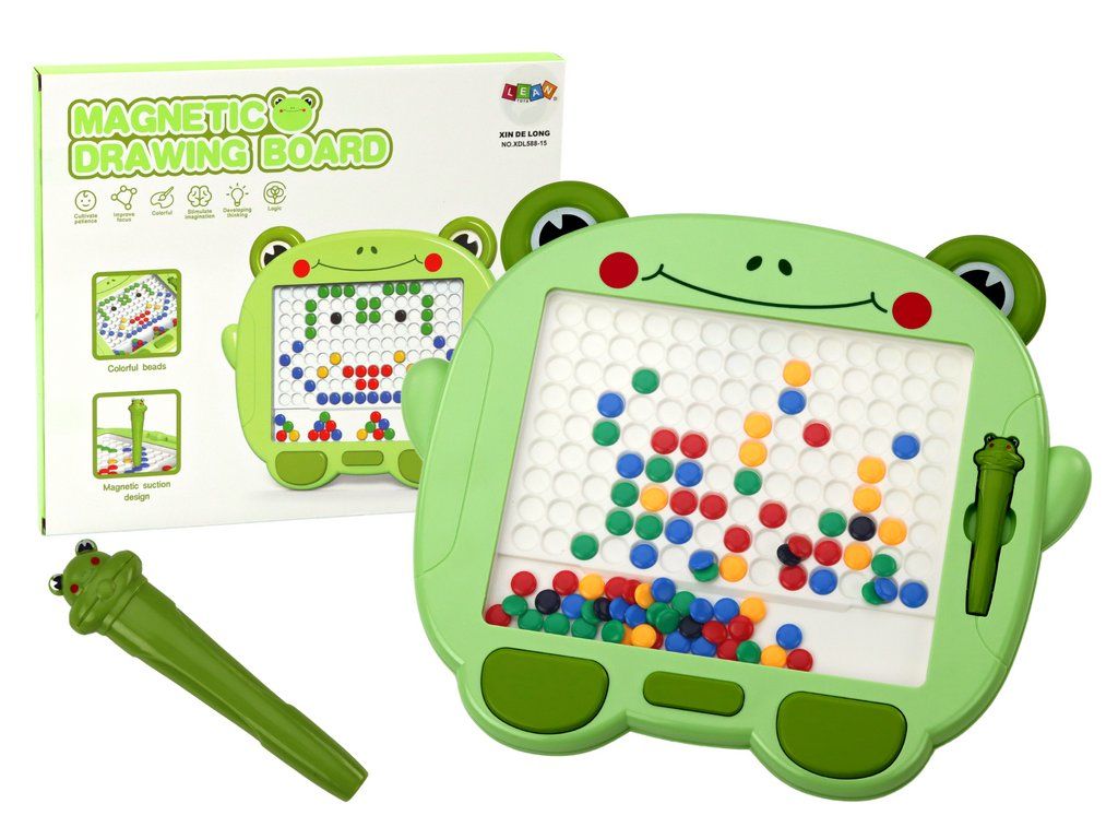 Magnetická tabule ve tvaru roztomilé žabky je ideální hračkou pro rozvoj kreativity a jemné motoriky u dětí. Tabule je vybavena velkou bílou plochou a barevnými magnetickými korálky, které děti mohou uspořádávat pomocí magnetického pera s motivem žabky. Po dokončení obrázku stačí tabulí zatřást, aby se kresba vymazala, a děti tak mohou tvořit stále nové vzory.