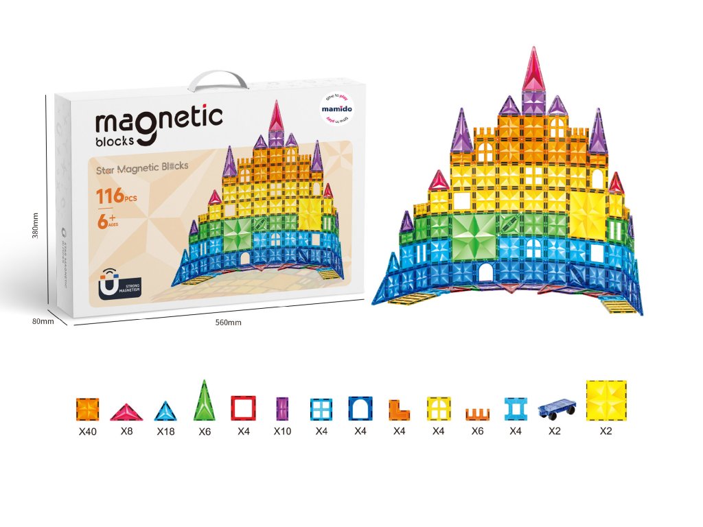 Barevná magnetická stavebnice Star Magnetic Blocks nabízí dětem neomezené možnosti pro tvoření hradů, domků, mostů i fantazijních staveb. Sada obsahuje 116 dílů v různých tvarech – čtverce, trojúhelníky, obdélníky, schody i podvozky s kolečky.