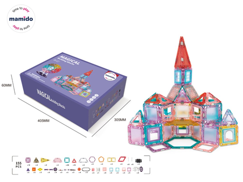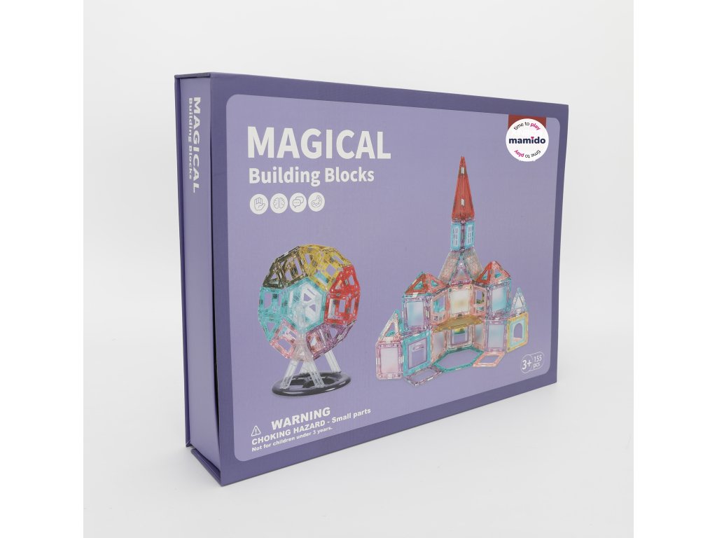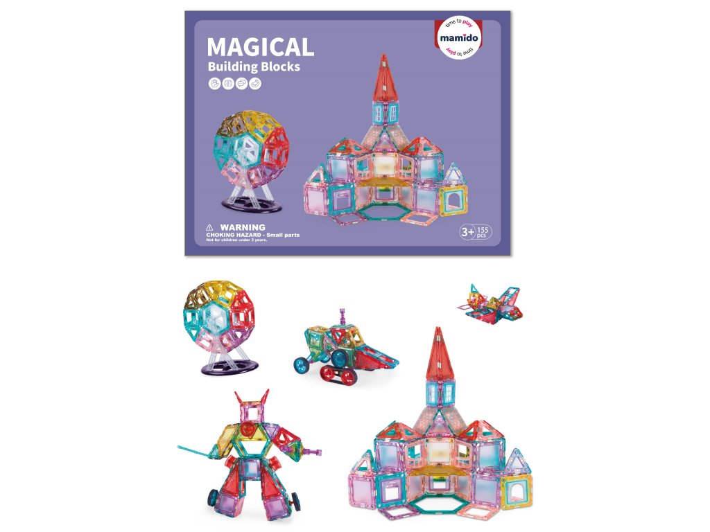 Rozviňte dětskou kreativitu a představivost s barevnou magnetickou stavebnicí Magical Building Blocks. Sada obsahuje 155 dílků různých tvarů – čtverce, trojúhelníky, obdélníky i speciální prvky, které umožňují stavět domy, věže, vozidla nebo originální 3D modely.