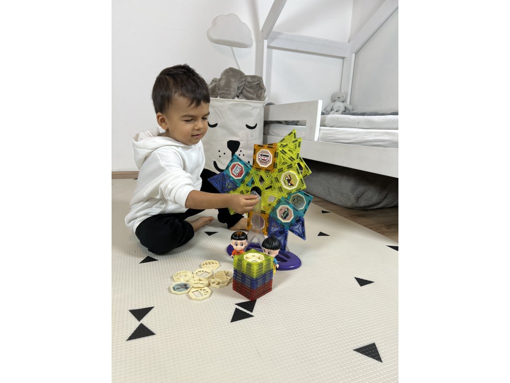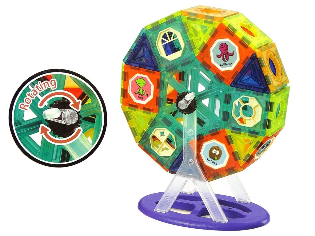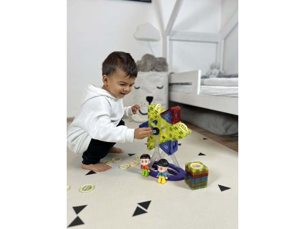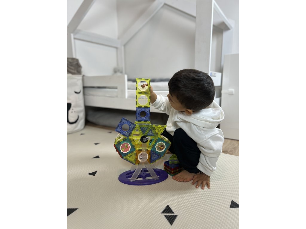 Magnetické kostky jsou vynikající vzdělávací hračkou, rozvíjí dětskou kreativitu, učí je trpělivosti a soustředění. Díky speciální základně můžete postavit ruské kolo nebo kolotoč a vytvořit si tak v pokojíčku malý lunapark.