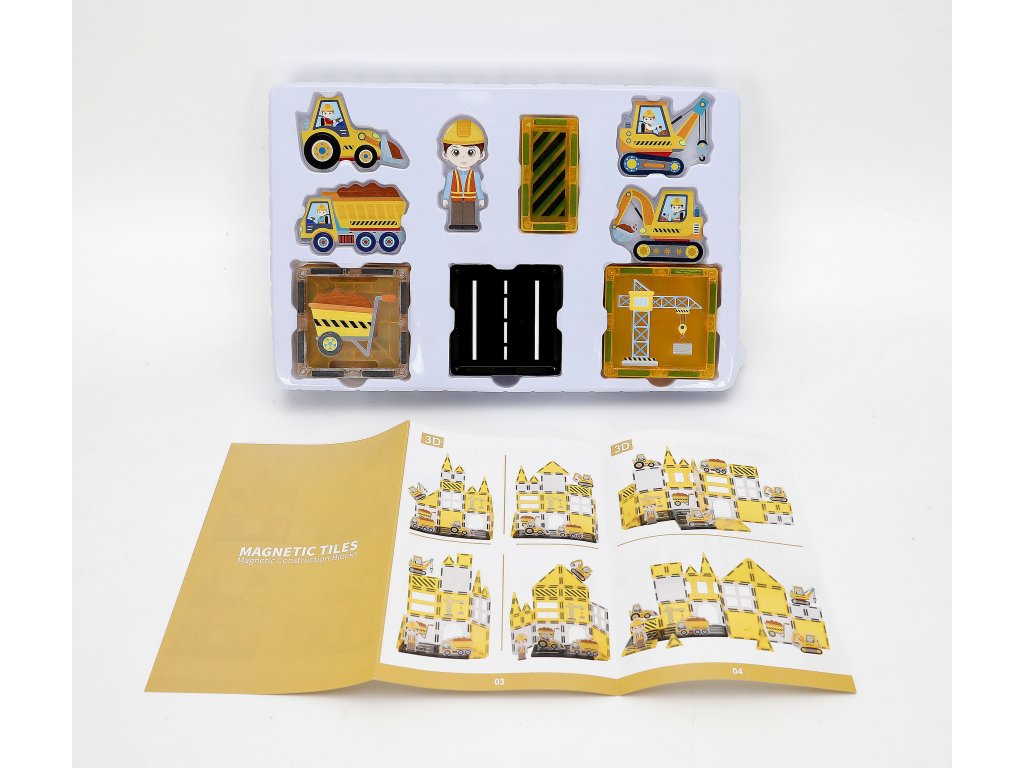 - Obsahuje: magnetické kostky, silniční dílky, dopravní značky, jeřáb, autíčka a další doplňky